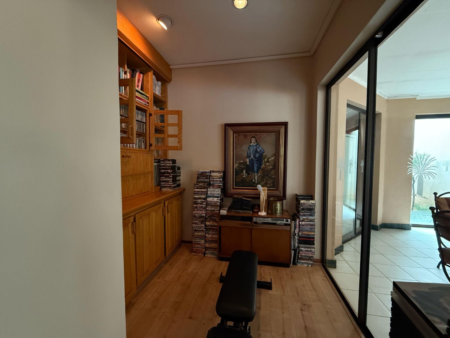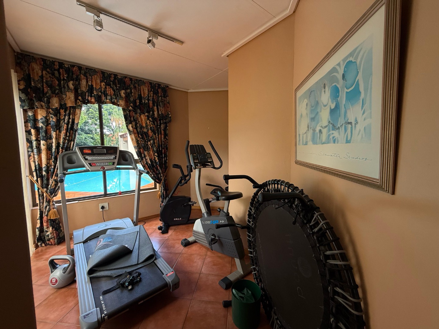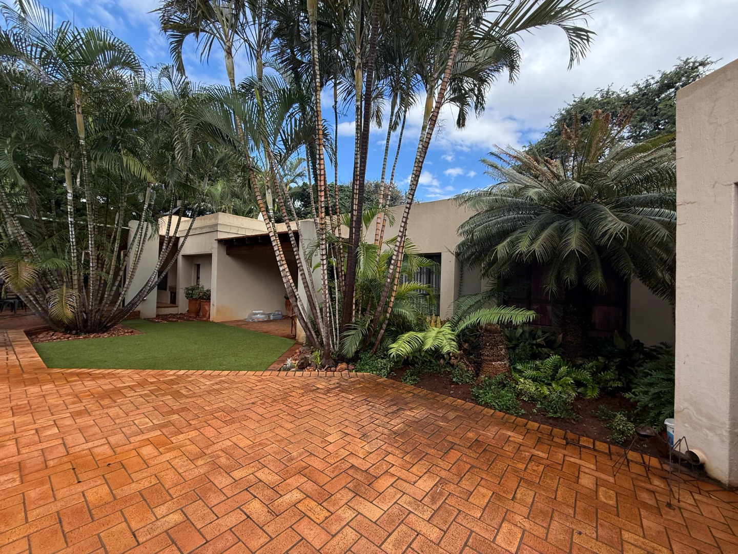 The modern kitchen features a pantry, scullery, and separate laundry room, with a convenient sliding door to close off the TV room for added privacy. Outside, a lush, expansive garden surrounds the sparkling swimming pool – all kept green and thriving with a borehole and irrigation system.