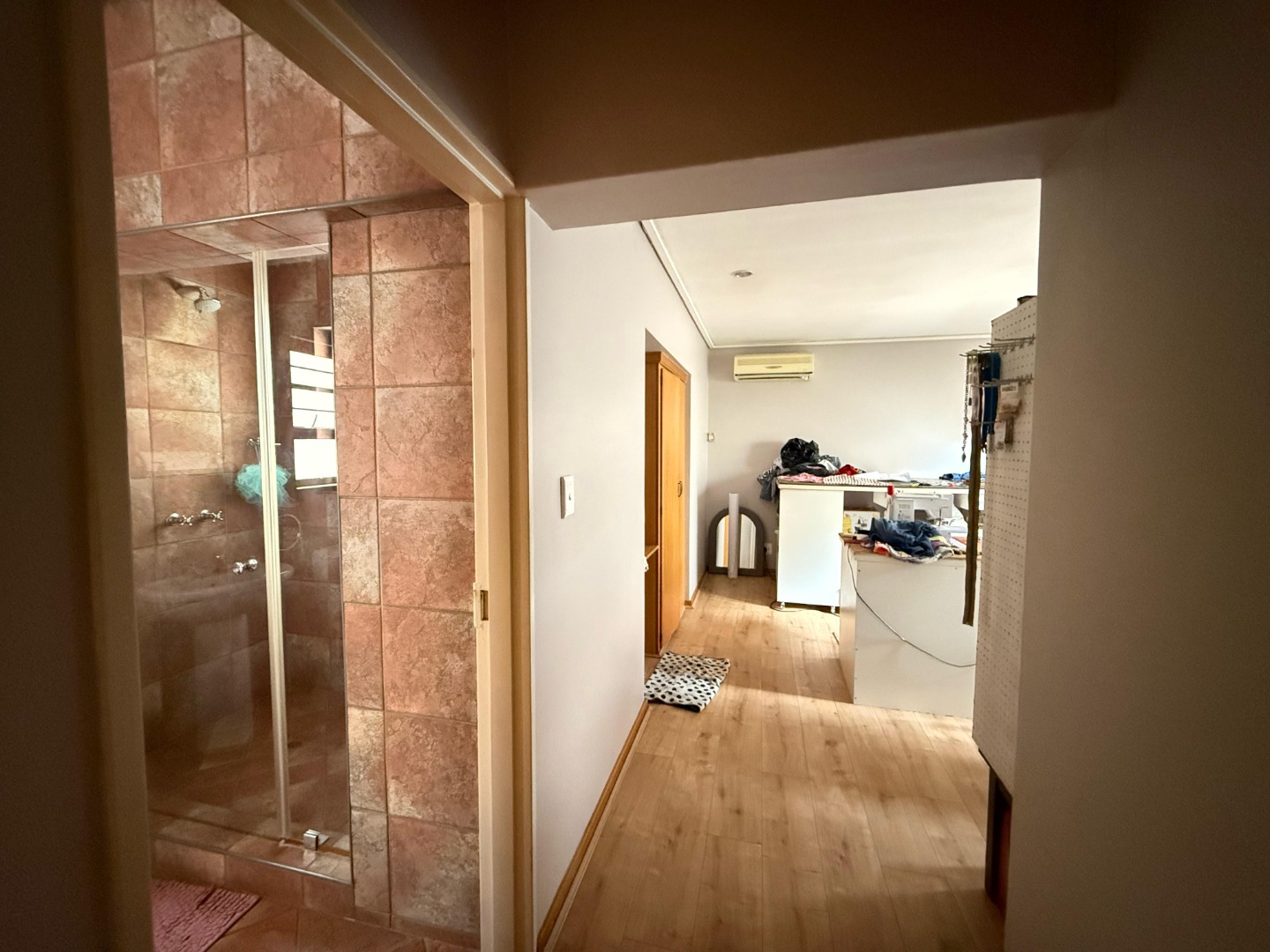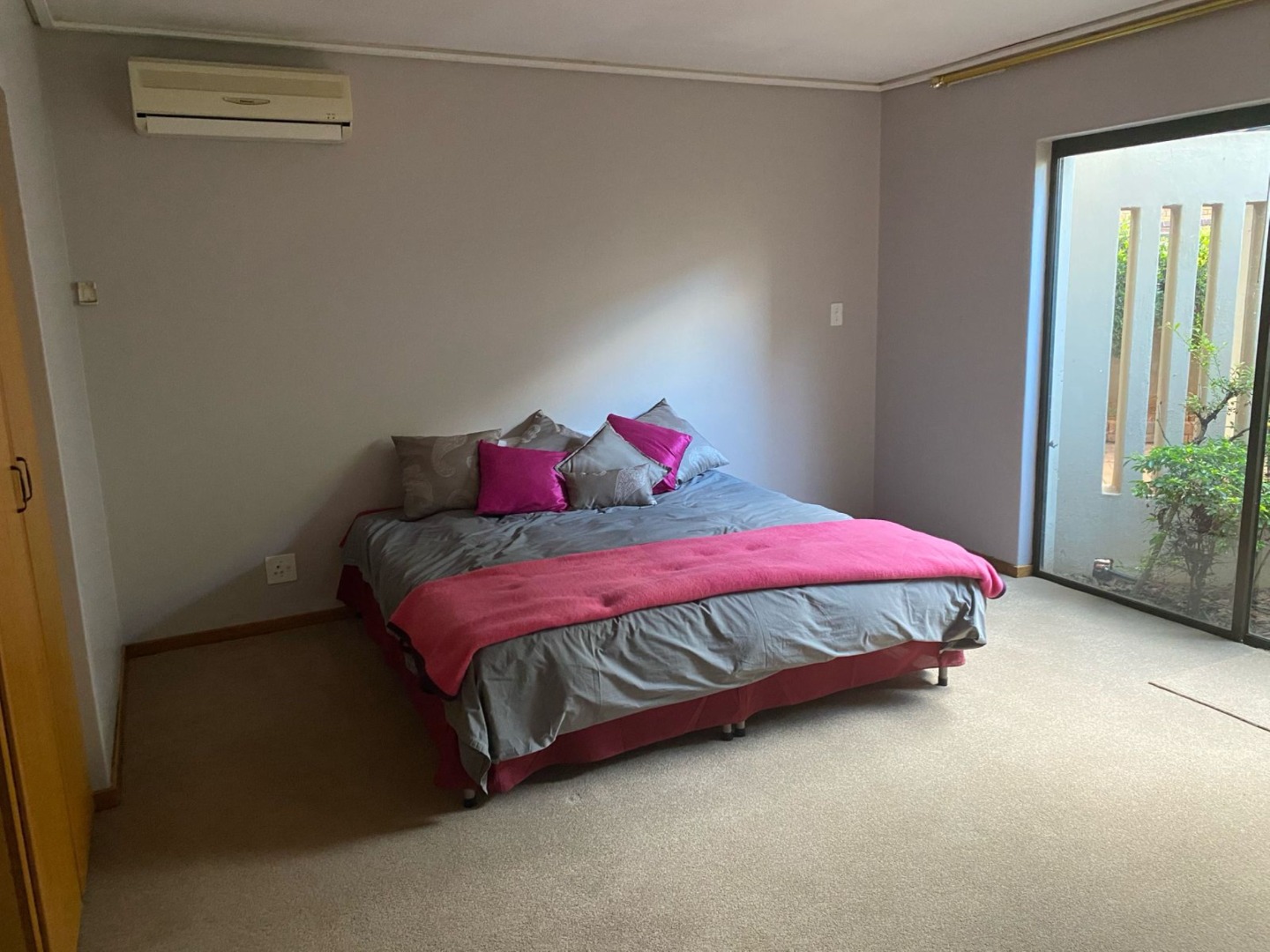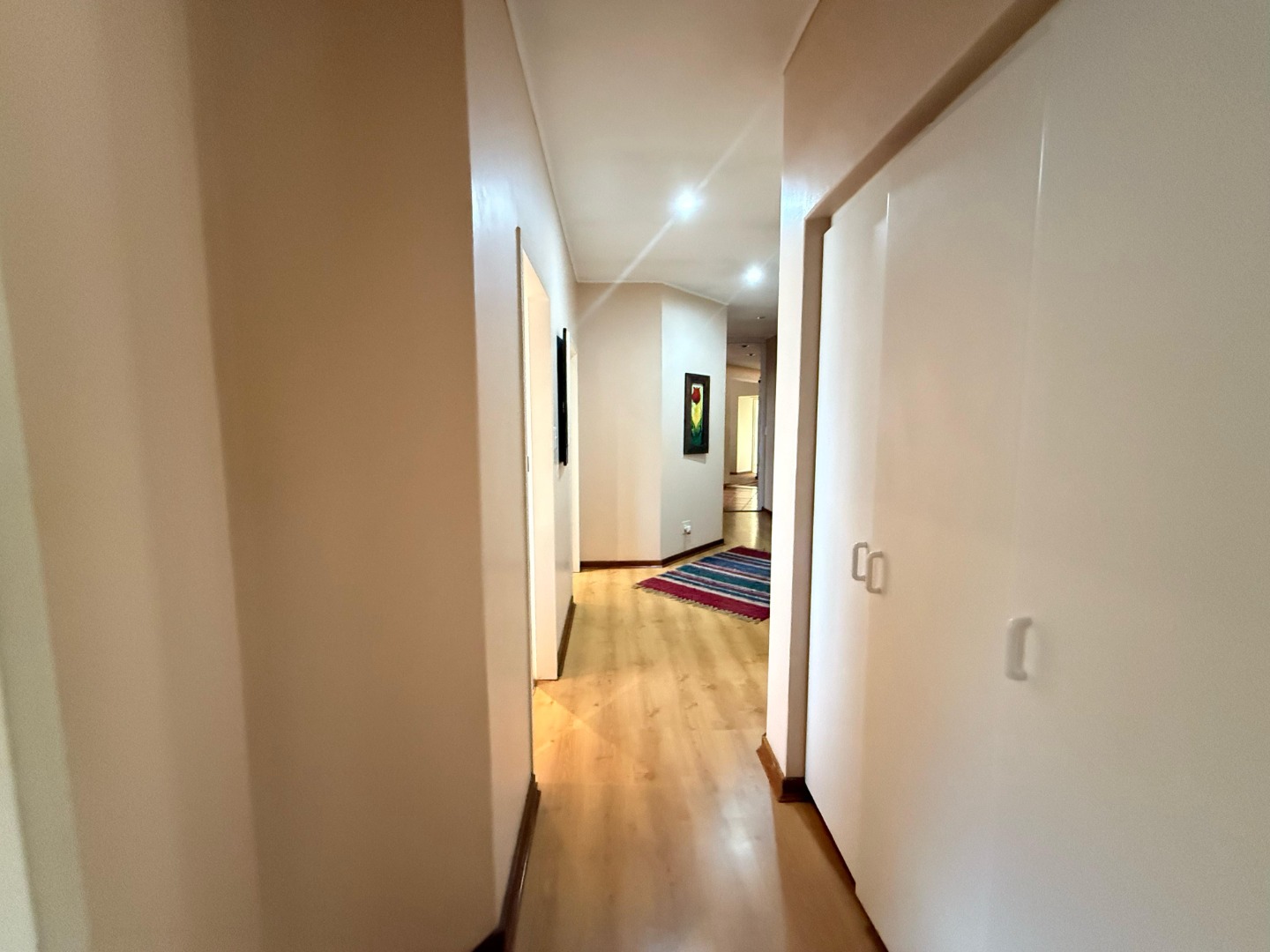The modern kitchen features a pantry, scullery, and separate laundry room, with a convenient sliding door to close off the TV room for added privacy. Outside, a lush, expansive garden surrounds the sparkling swimming pool – all kept green and thriving with a borehole and irrigation system.