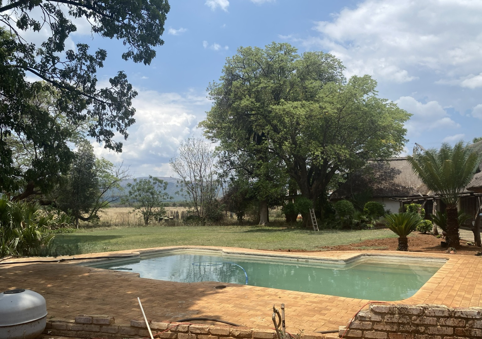 The spacious farmhouse features 4 bedrooms (all with built-in cupboards), 3 bathrooms, a modern kitchen, dining room, lounge, and a loft ideal for an office or guest space. Enjoy ultimate relaxation and entertainment with a sparkling pool, bar area, and a large Lapa for gatherings under the African sky.
