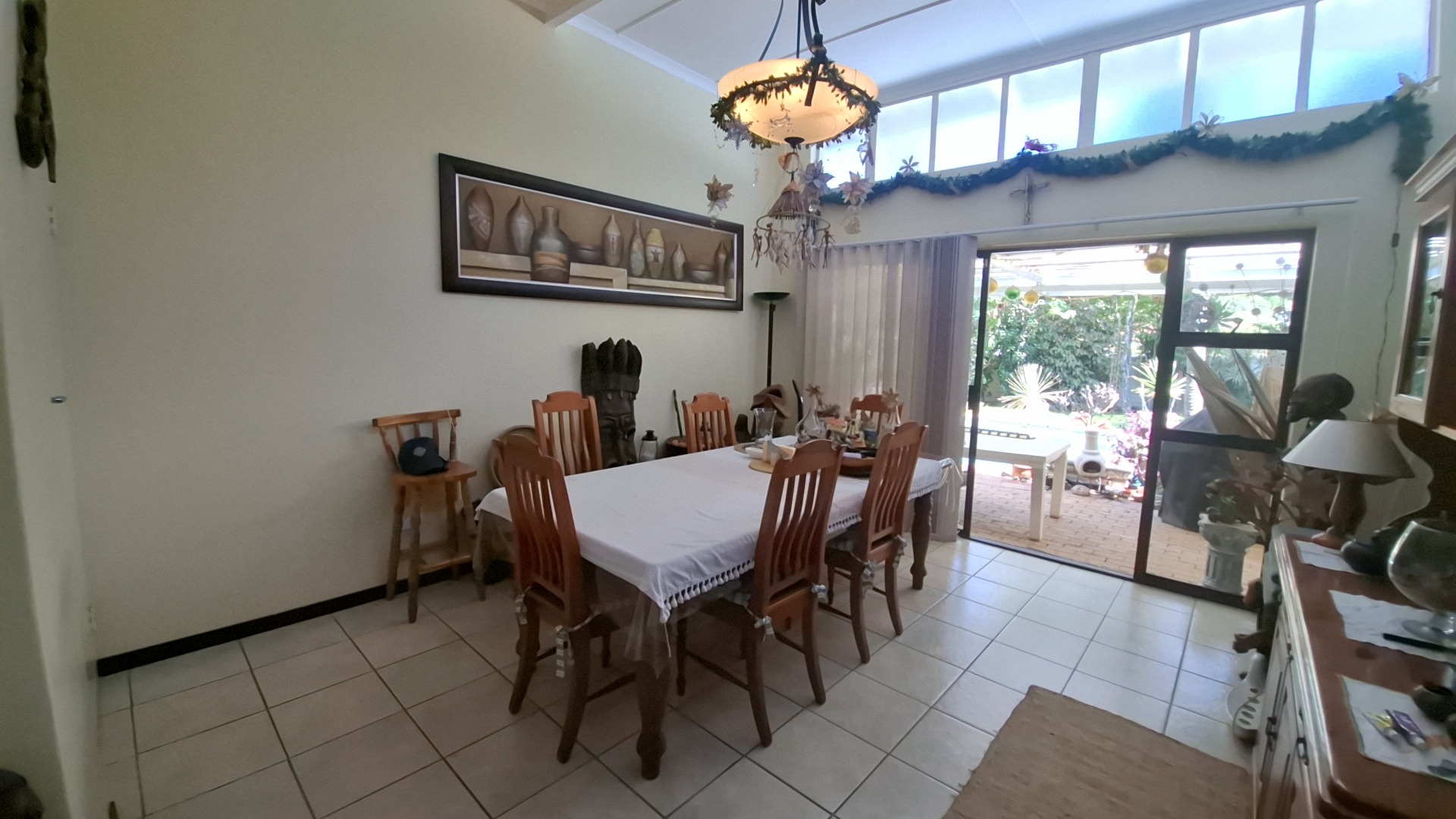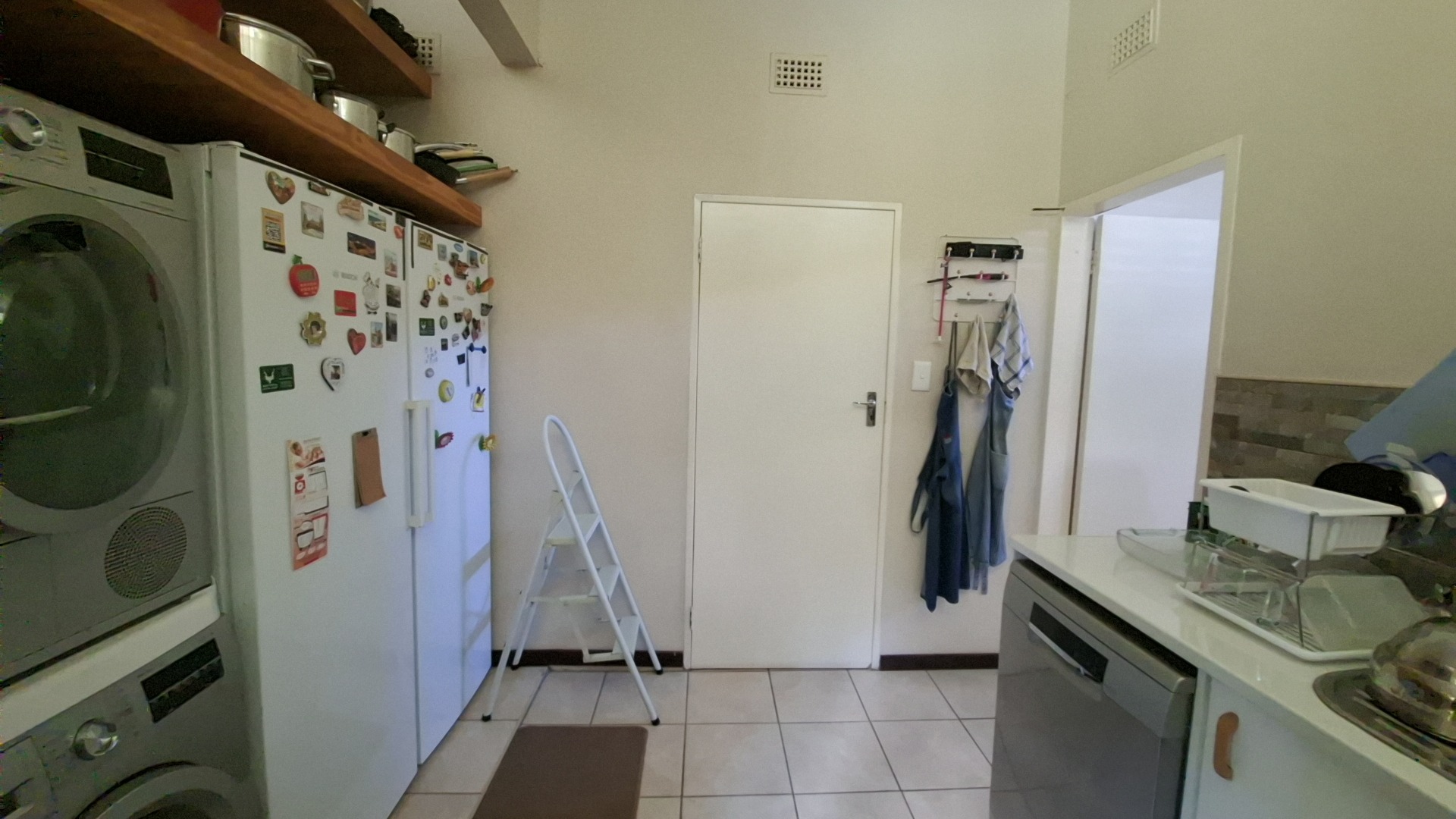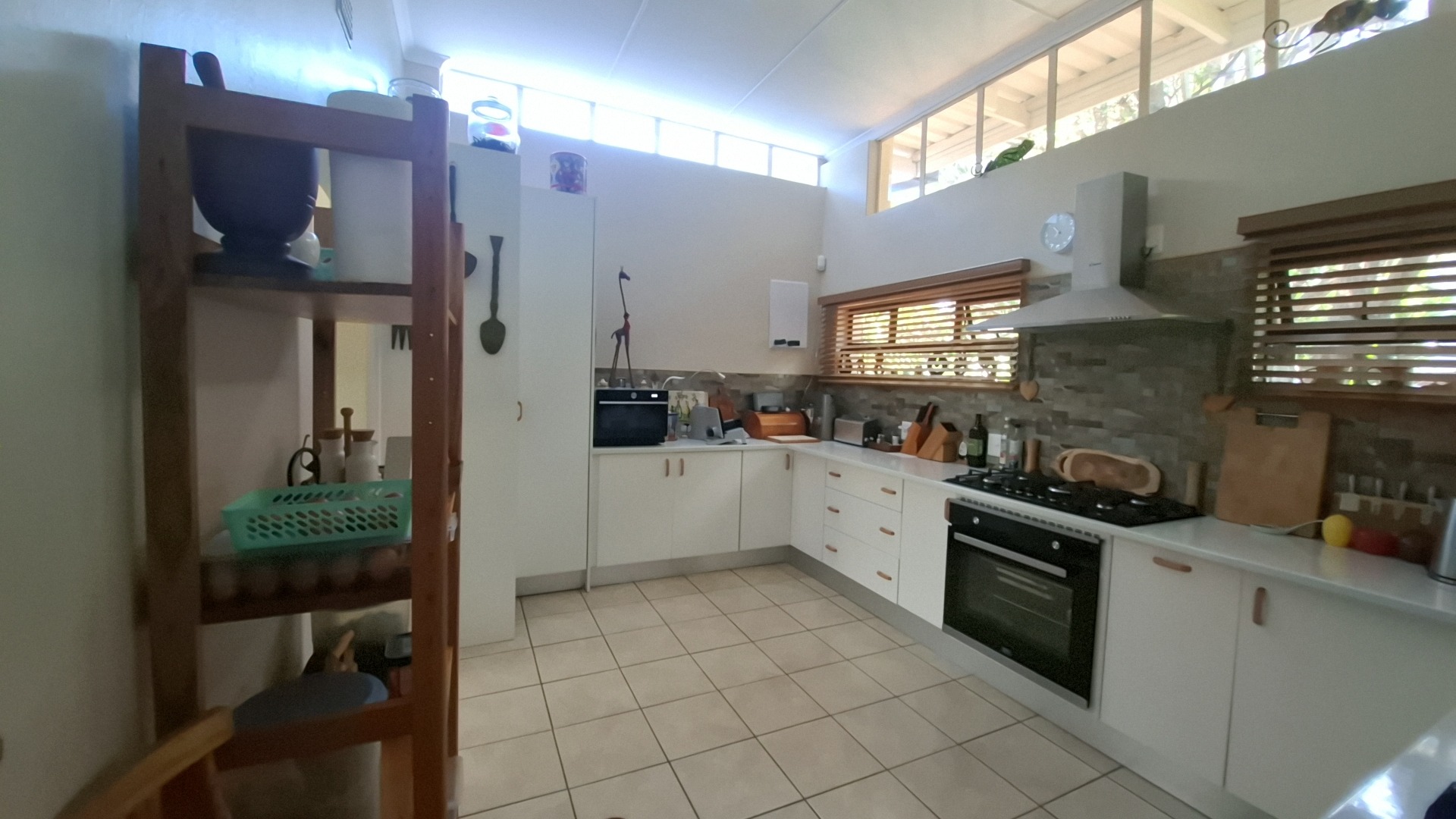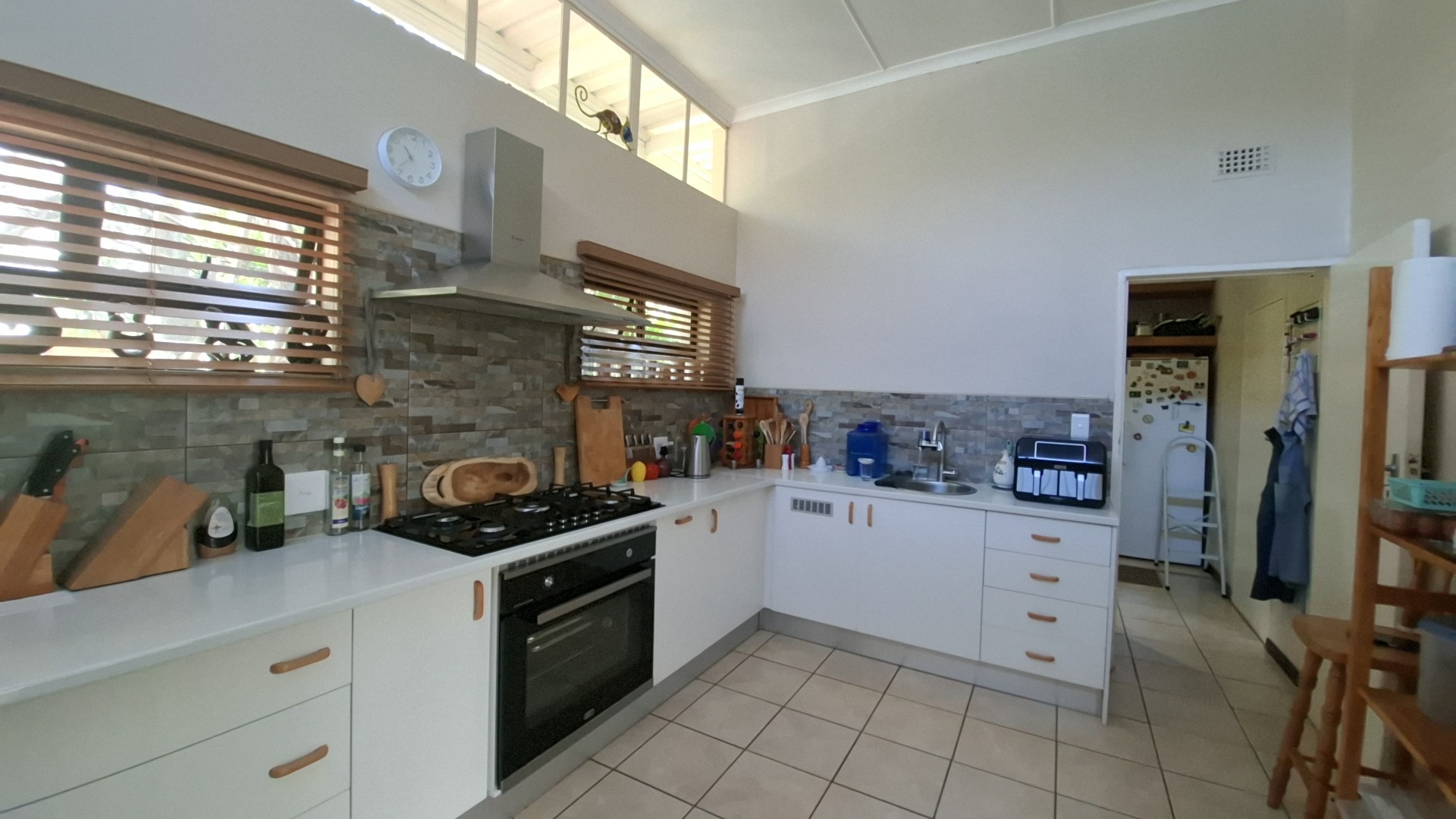 The open-plan kitchen is a chef’s delight, fitted with a gas stove, ample cupboard space, and a separate scullery fully equipped with washing machine and dishwasher connections. The kitchen flows seamlessly into the dining area, creating a warm and inviting entertainment space.