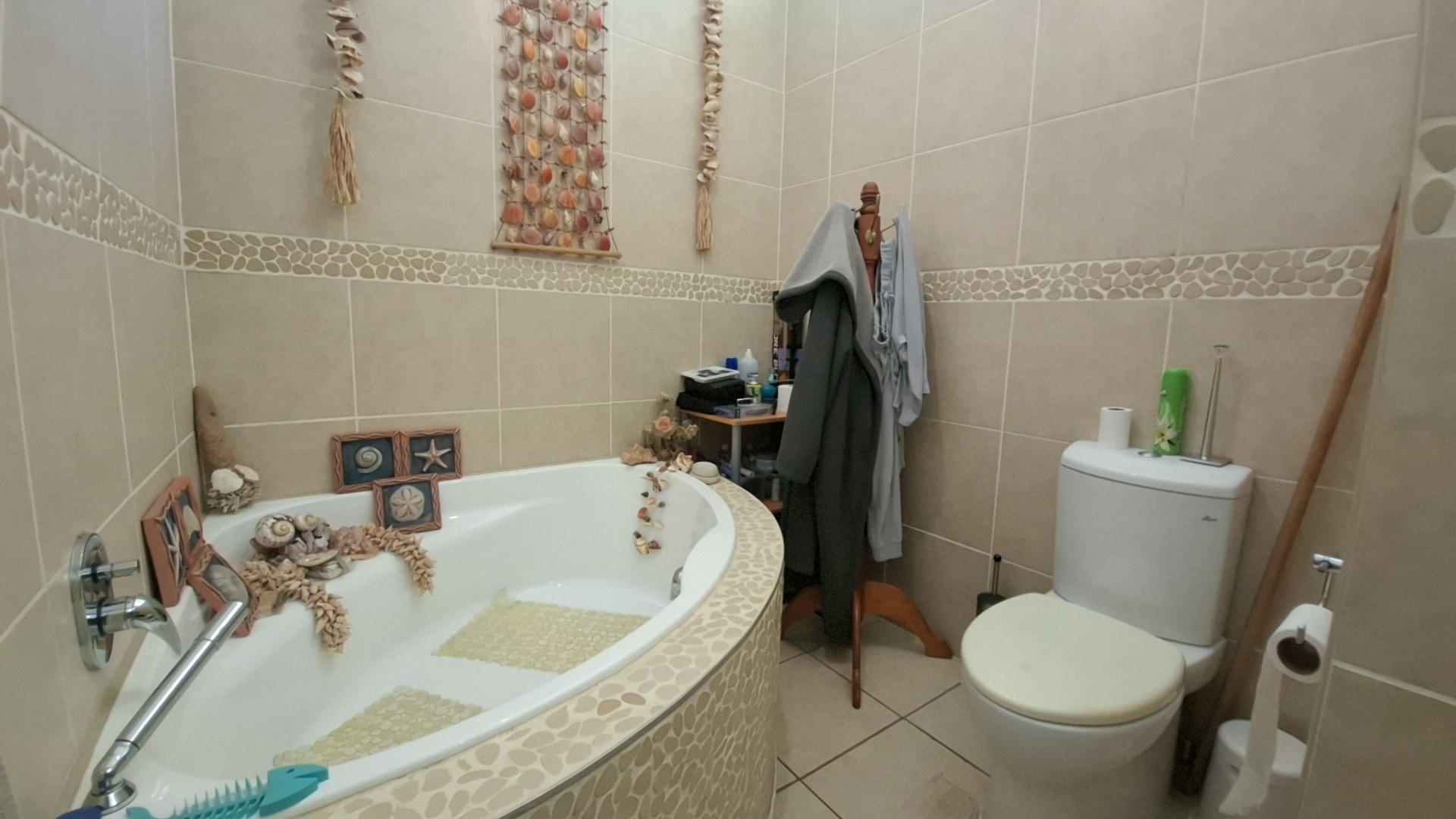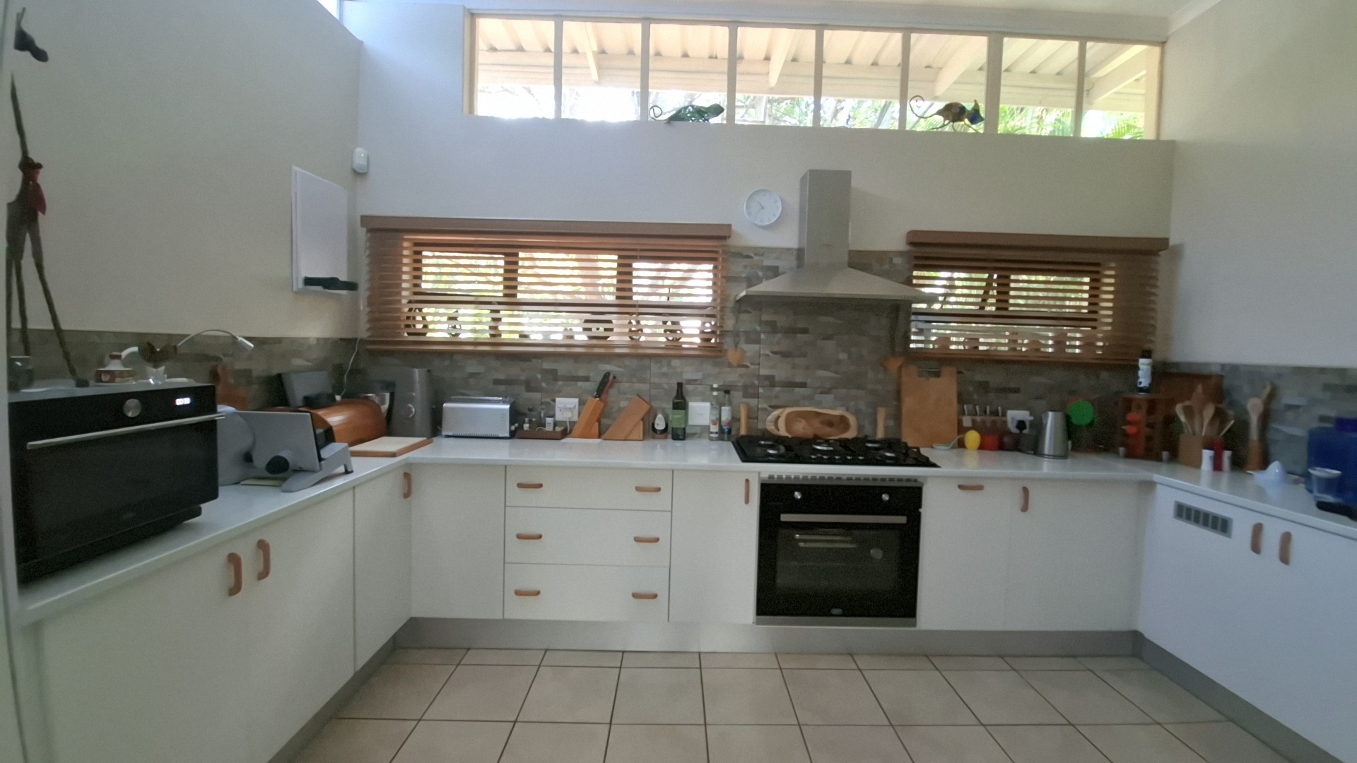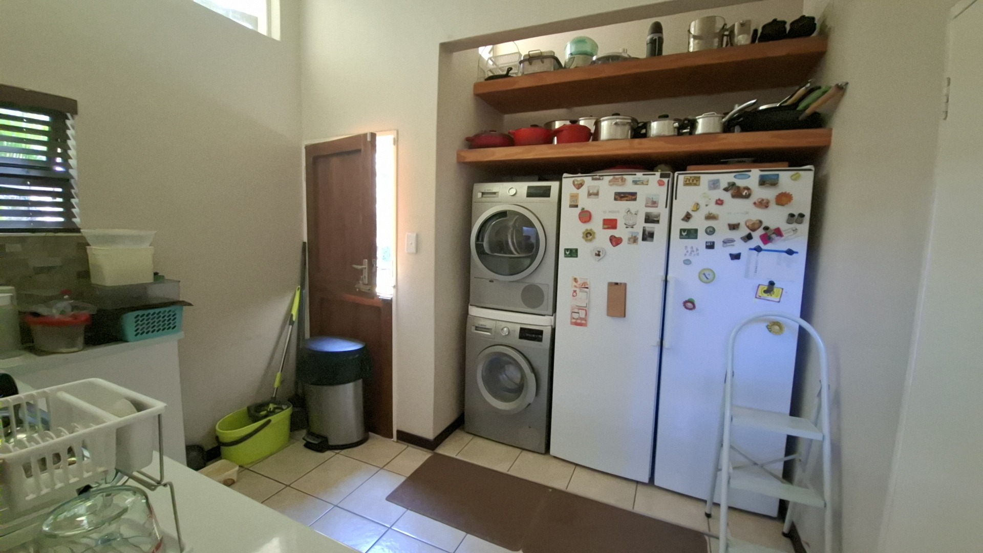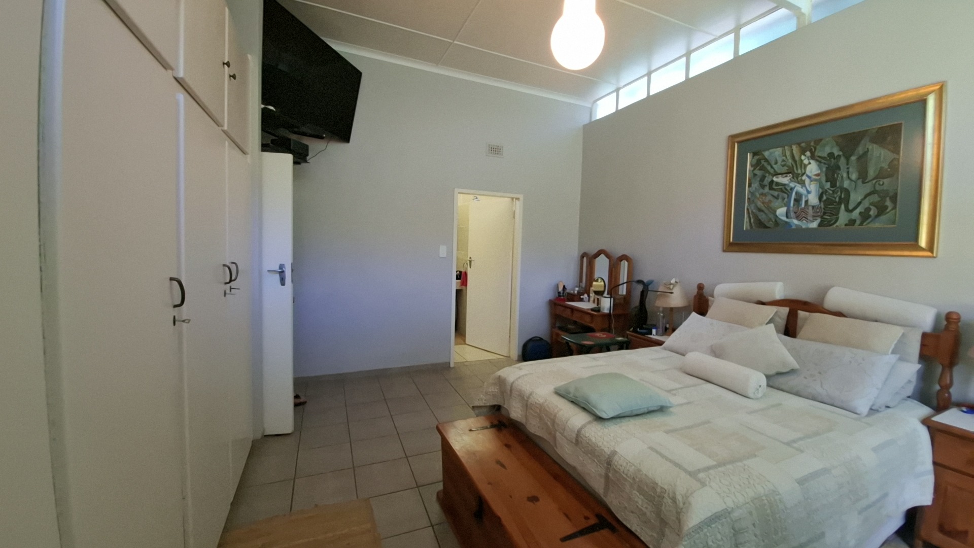 The open-plan kitchen is a chef’s delight, fitted with a gas stove, ample cupboard space, and a separate scullery fully equipped with washing machine and dishwasher connections. The kitchen flows seamlessly into the dining area, creating a warm and inviting entertainment space.