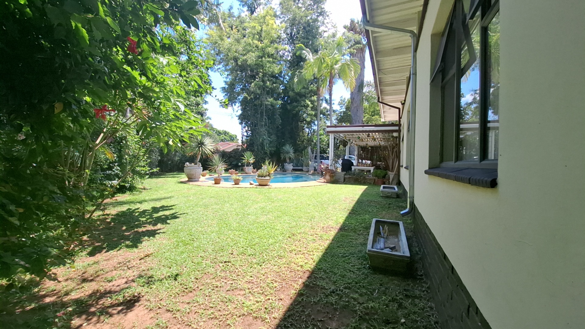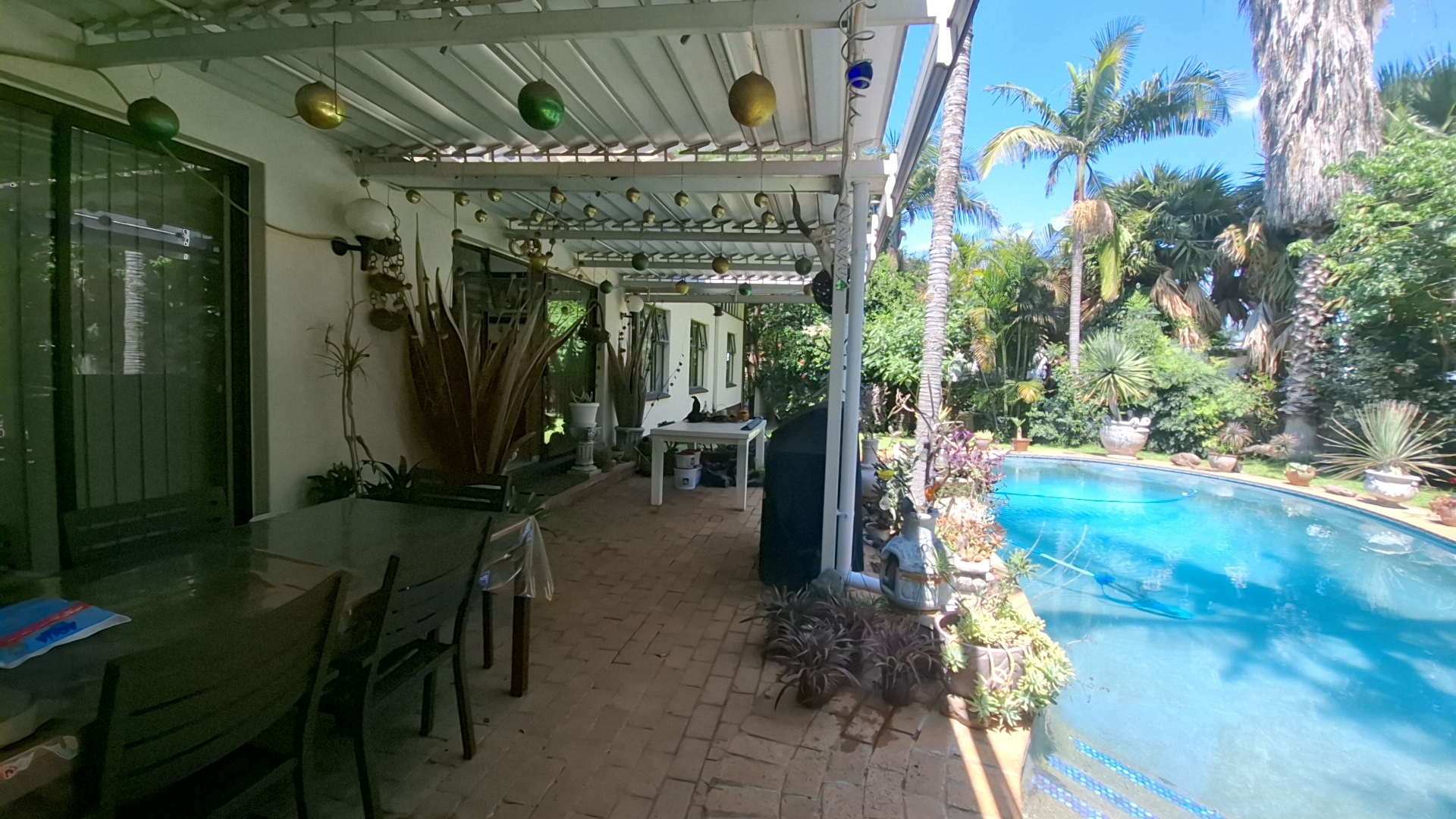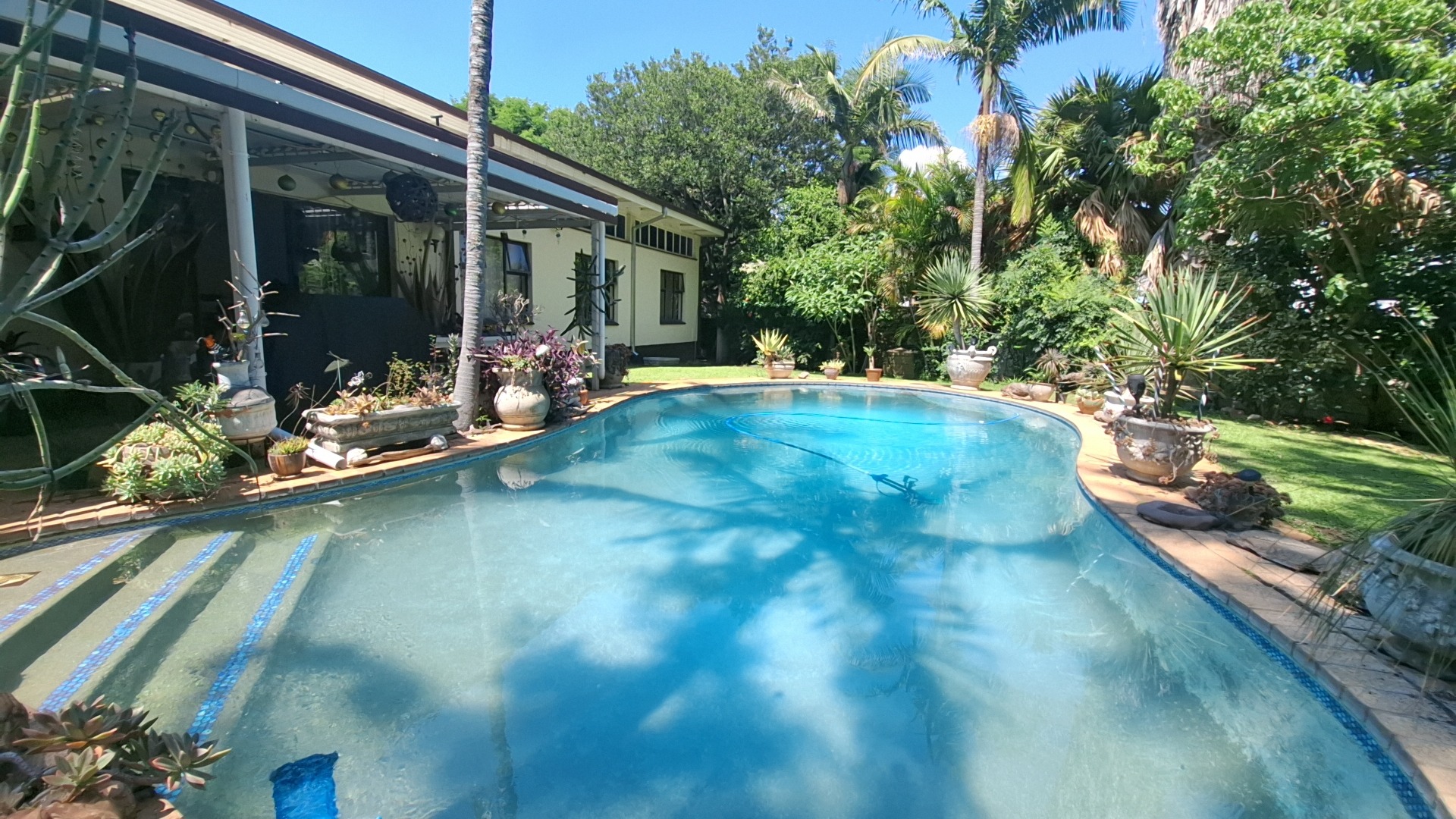 Outdoors, enjoy a sparkling swimming pool, a spacious veranda ideal for entertaining, a beautifully landscaped garden, and a striking driveway leading to a welcoming entrance. The property is pet-friendly, offering ample space for family living.