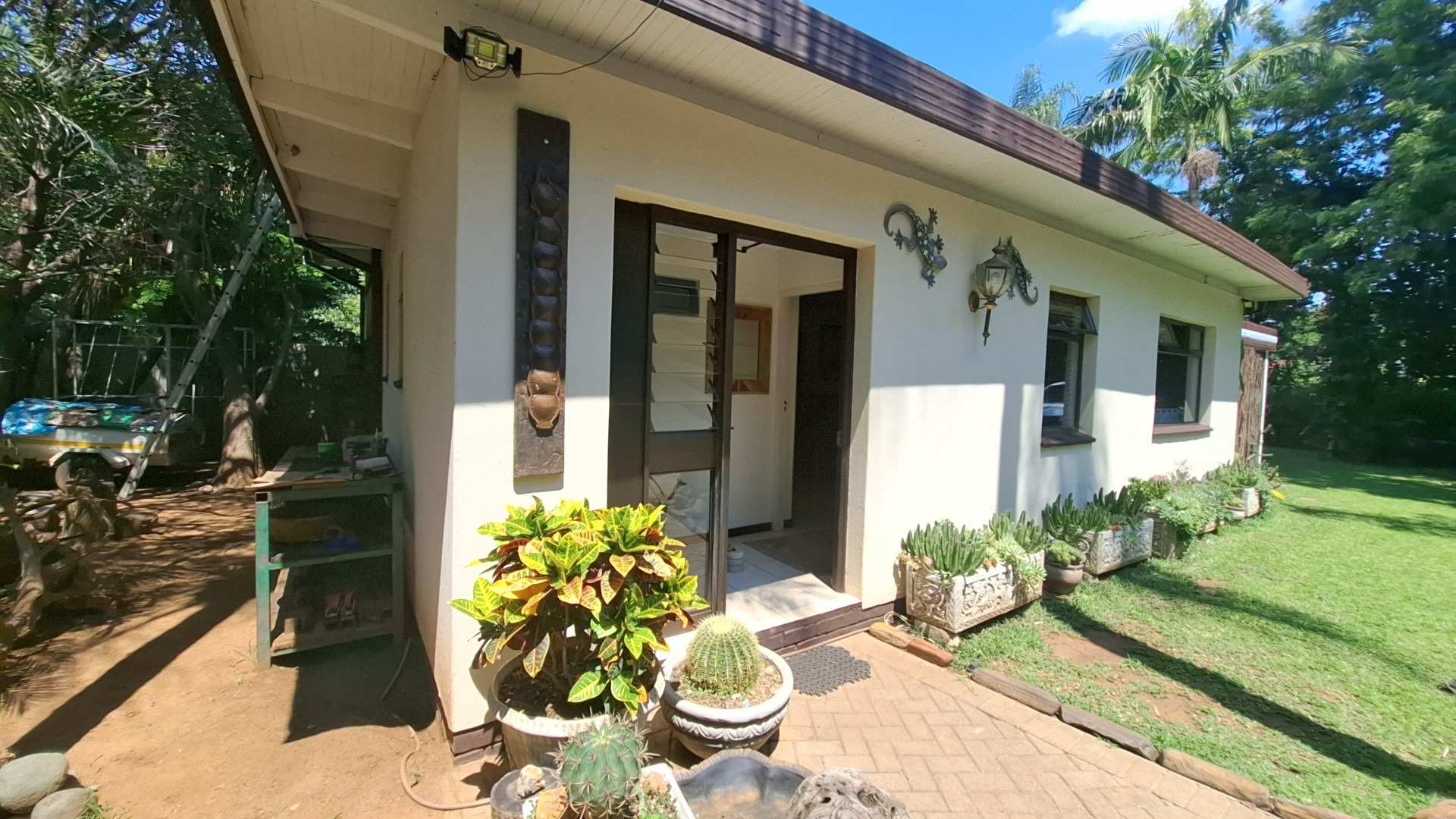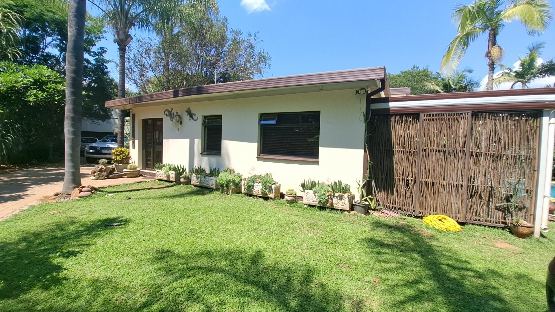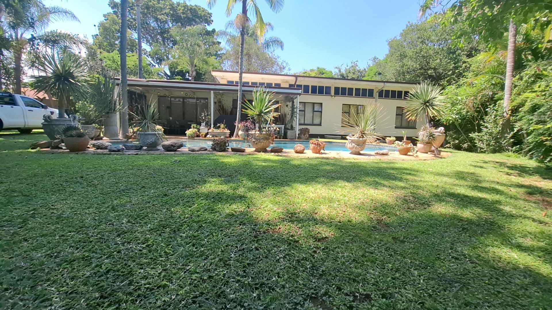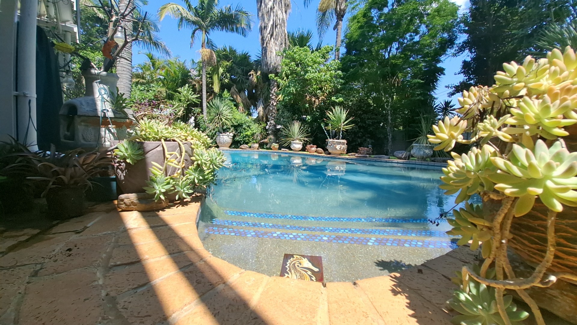 Outdoors, enjoy a sparkling swimming pool, a spacious veranda ideal for entertaining, a beautifully landscaped garden, and a striking driveway leading to a welcoming entrance. The property is pet-friendly, offering ample space for family living.