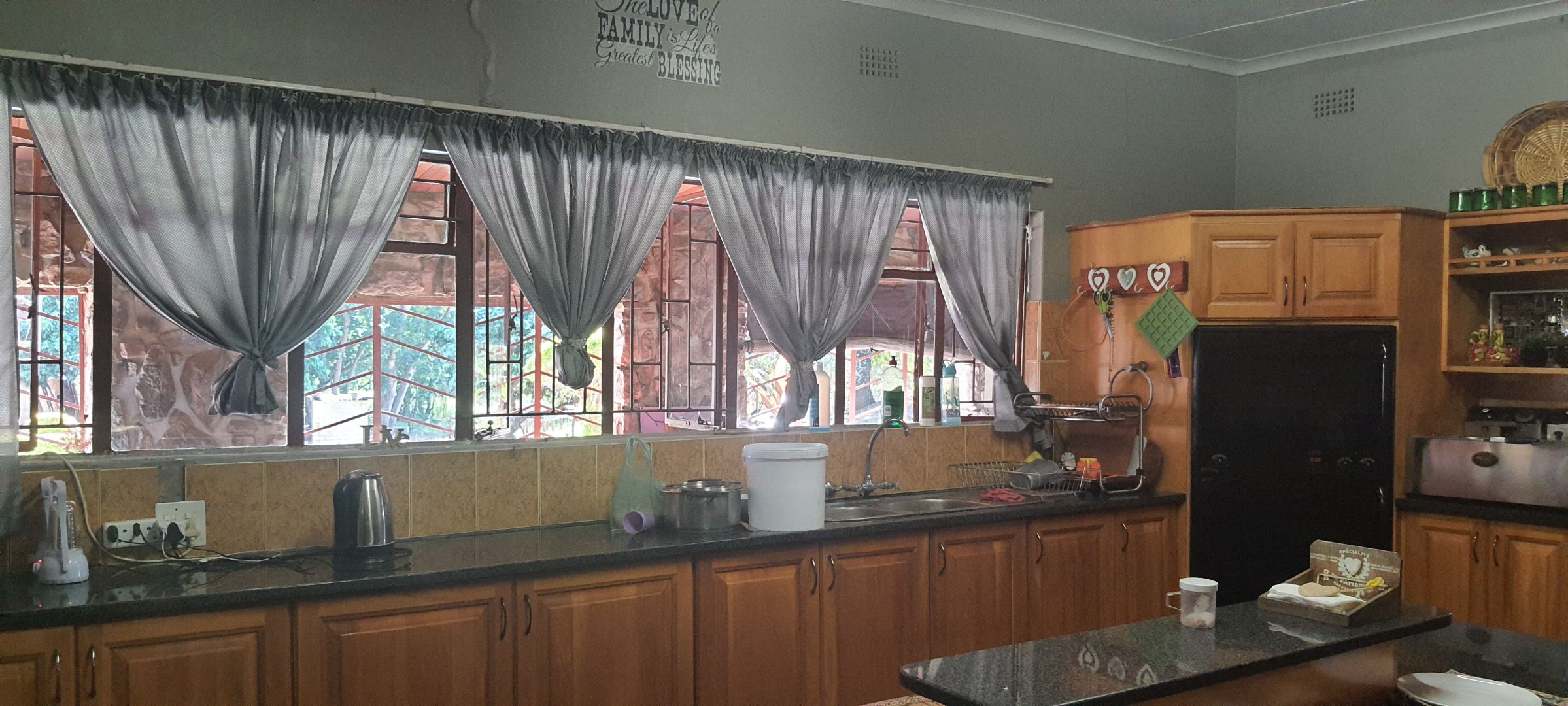Spacious 6 bedroom , 3 bathroom house. It boasts a large wrap around veranda with views of the garden. 3 living spaces with an entrance hall , dinning room, lounge and TV room and kitchen with granite tops. A Lapa next to a large swimming pool. A pond to add to the beautiful landscape
