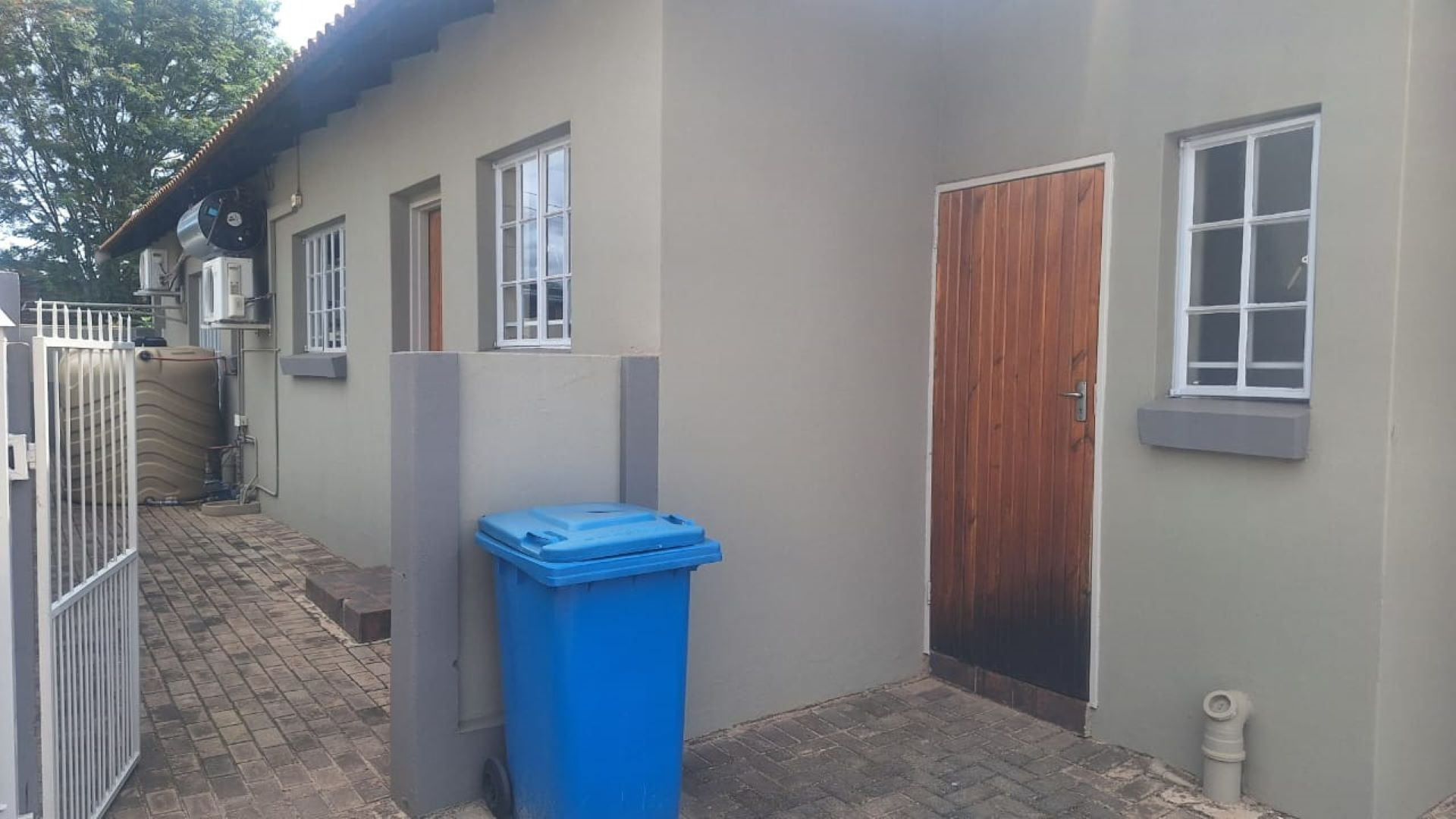 Outside offers a veranda with built-in braai, a small garden maintained by an included gardener, single lock-up garage, double carport, JoJo tank, and domestic toilet.
