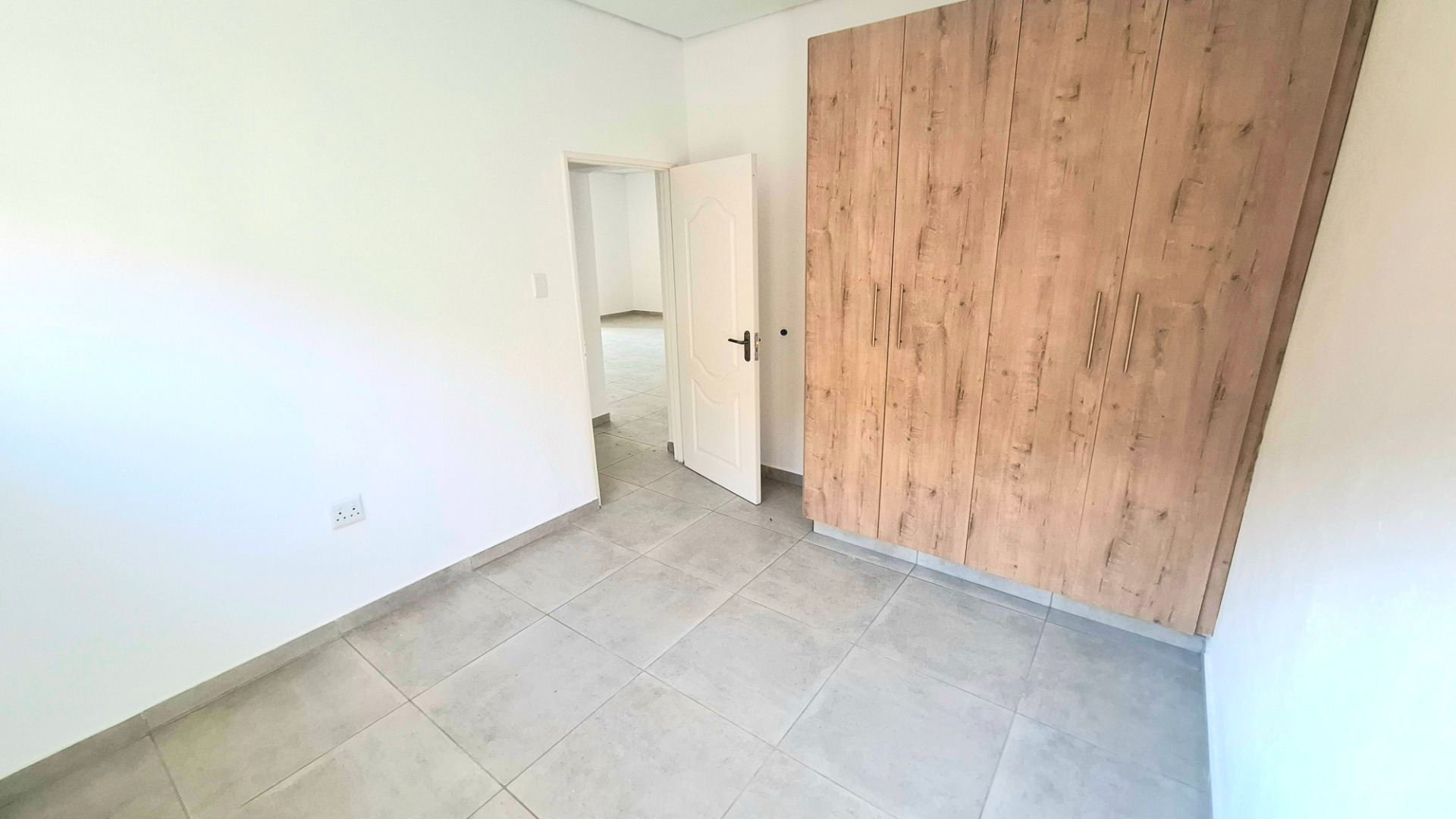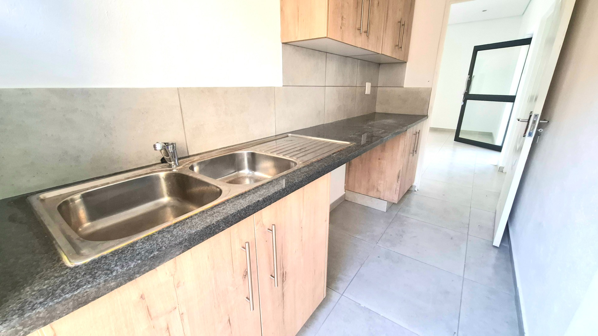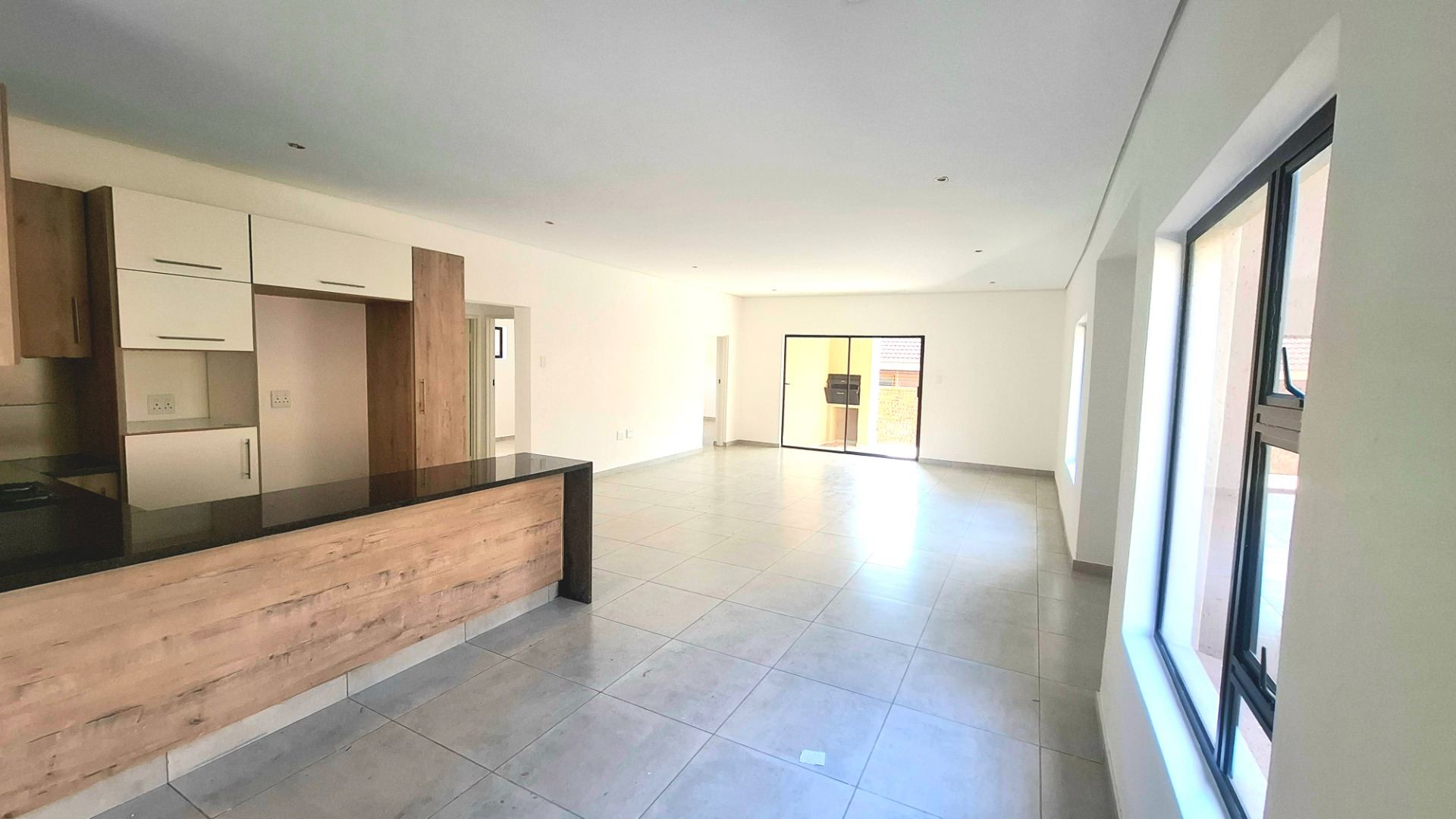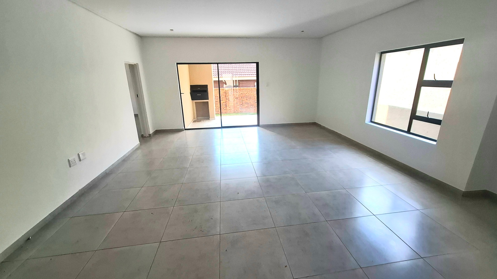 It features three bedrooms and two bathrooms, with the main bedroom boasting an en-suite. The open-plan kitchen and dining area flow into a spacious living room, creating a bright and functional layout. A patio with a built-in braai extends the living space outdoors, perfect for entertaining.