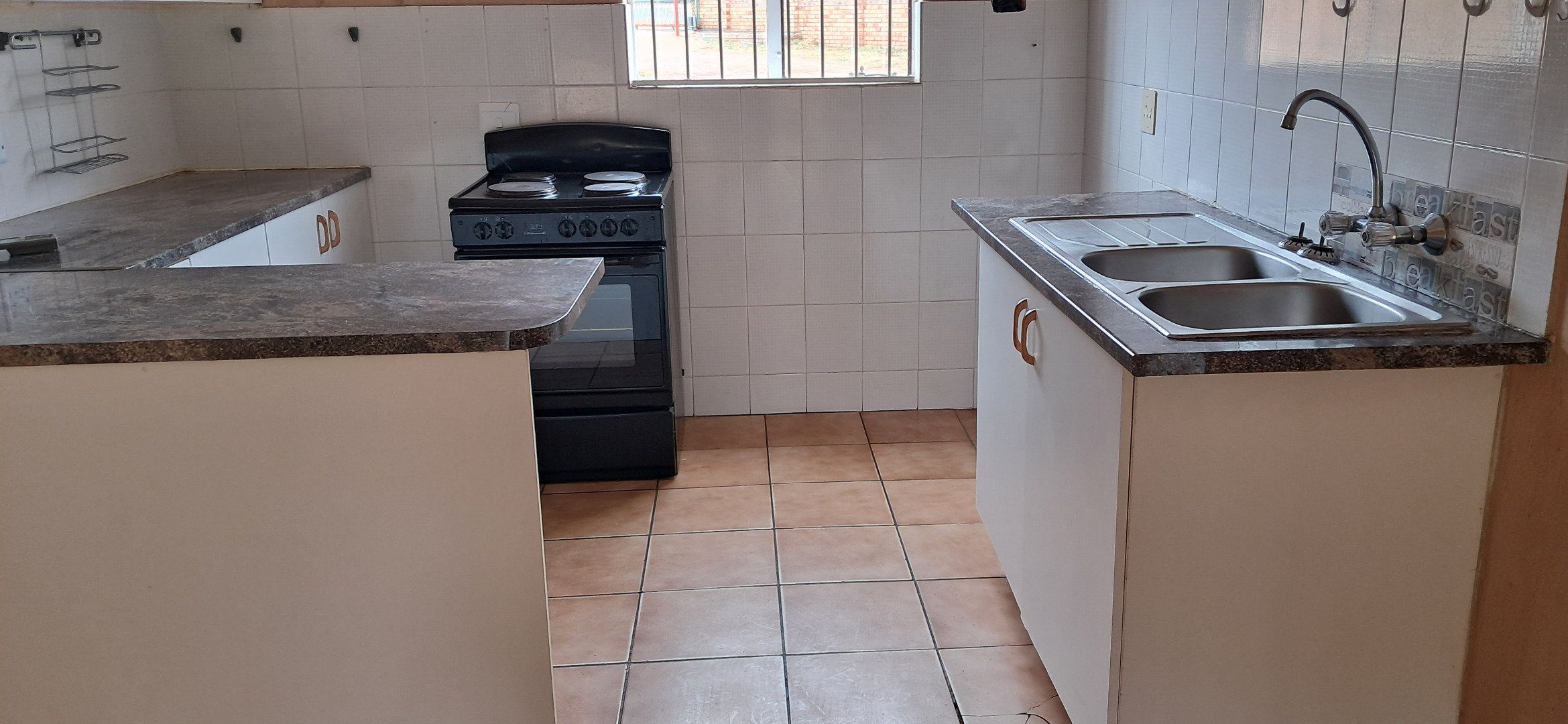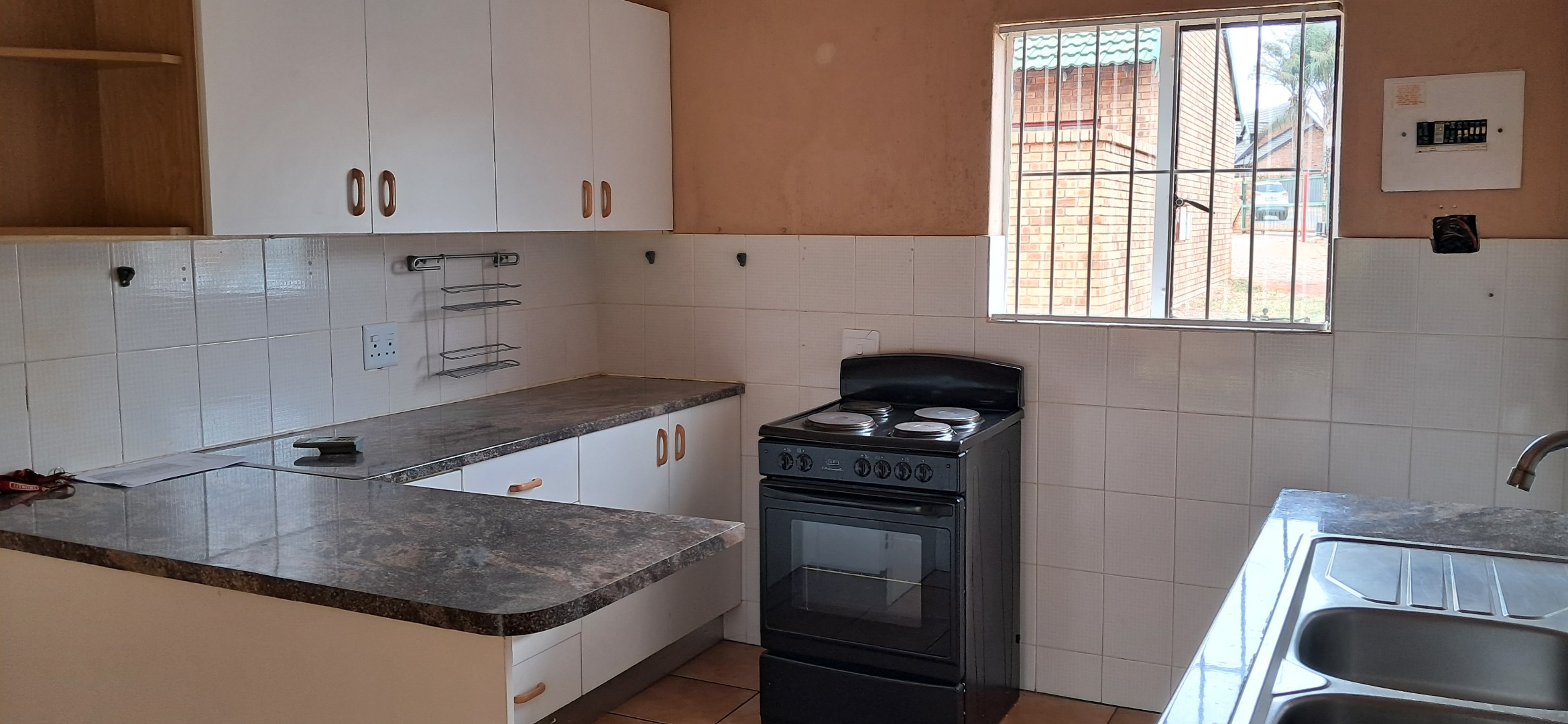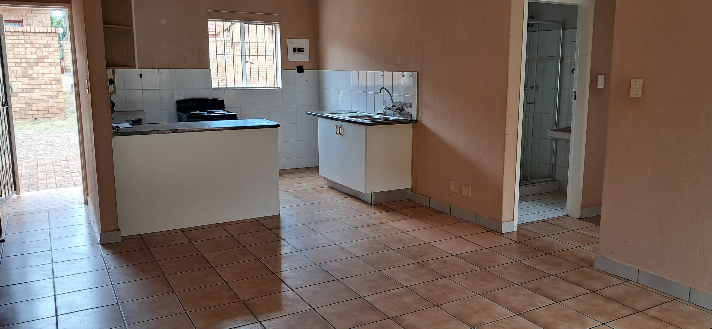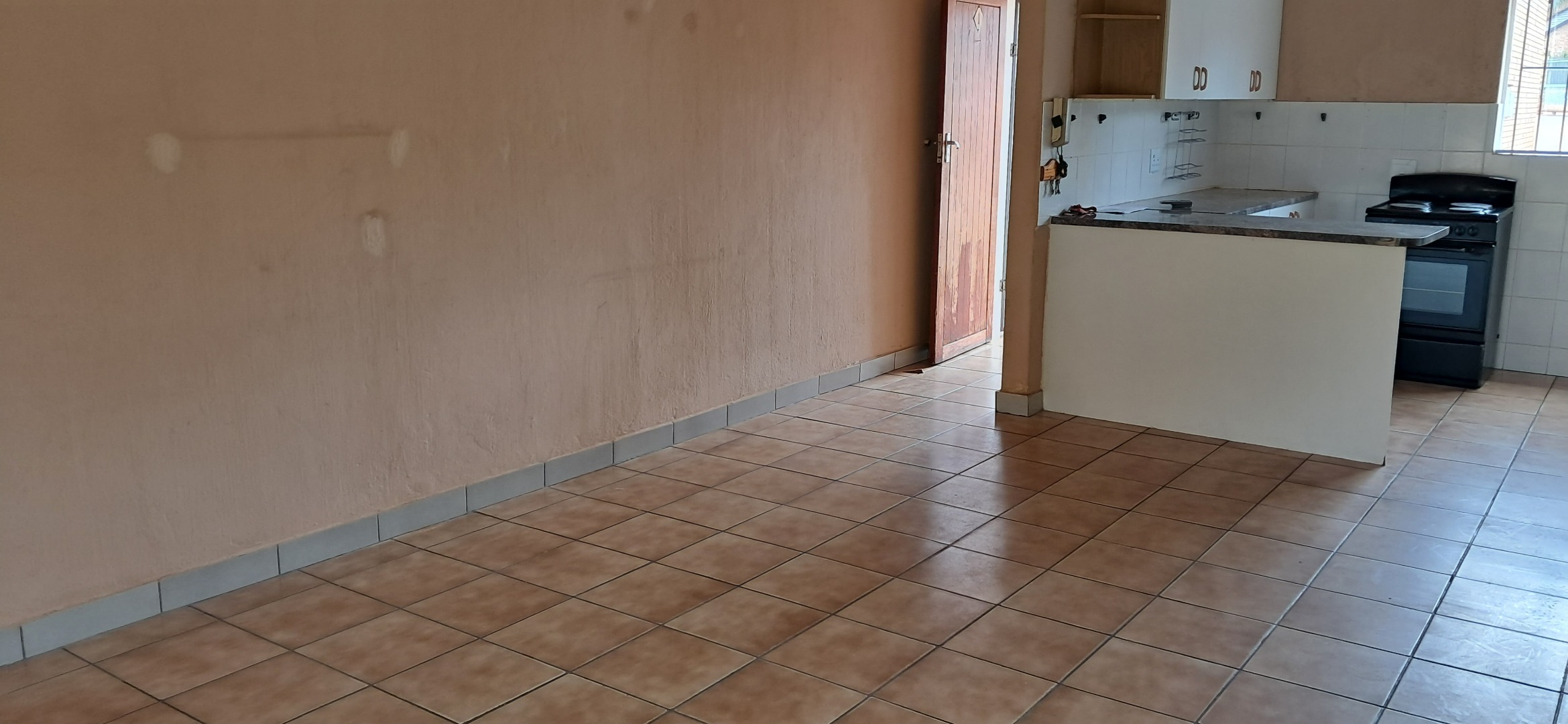 Open plan kitchen overlooks a living area with sliding doors that leads to a