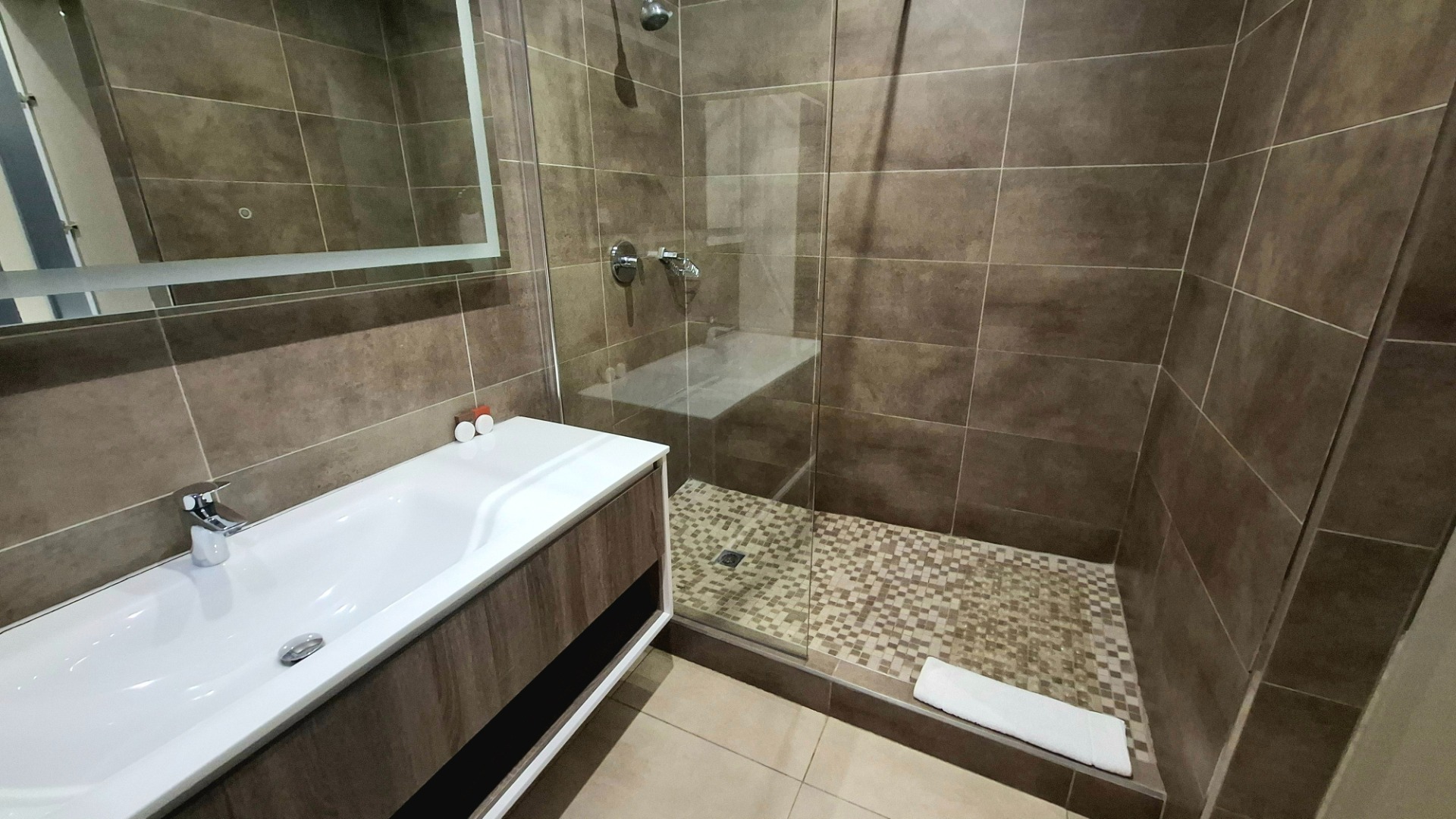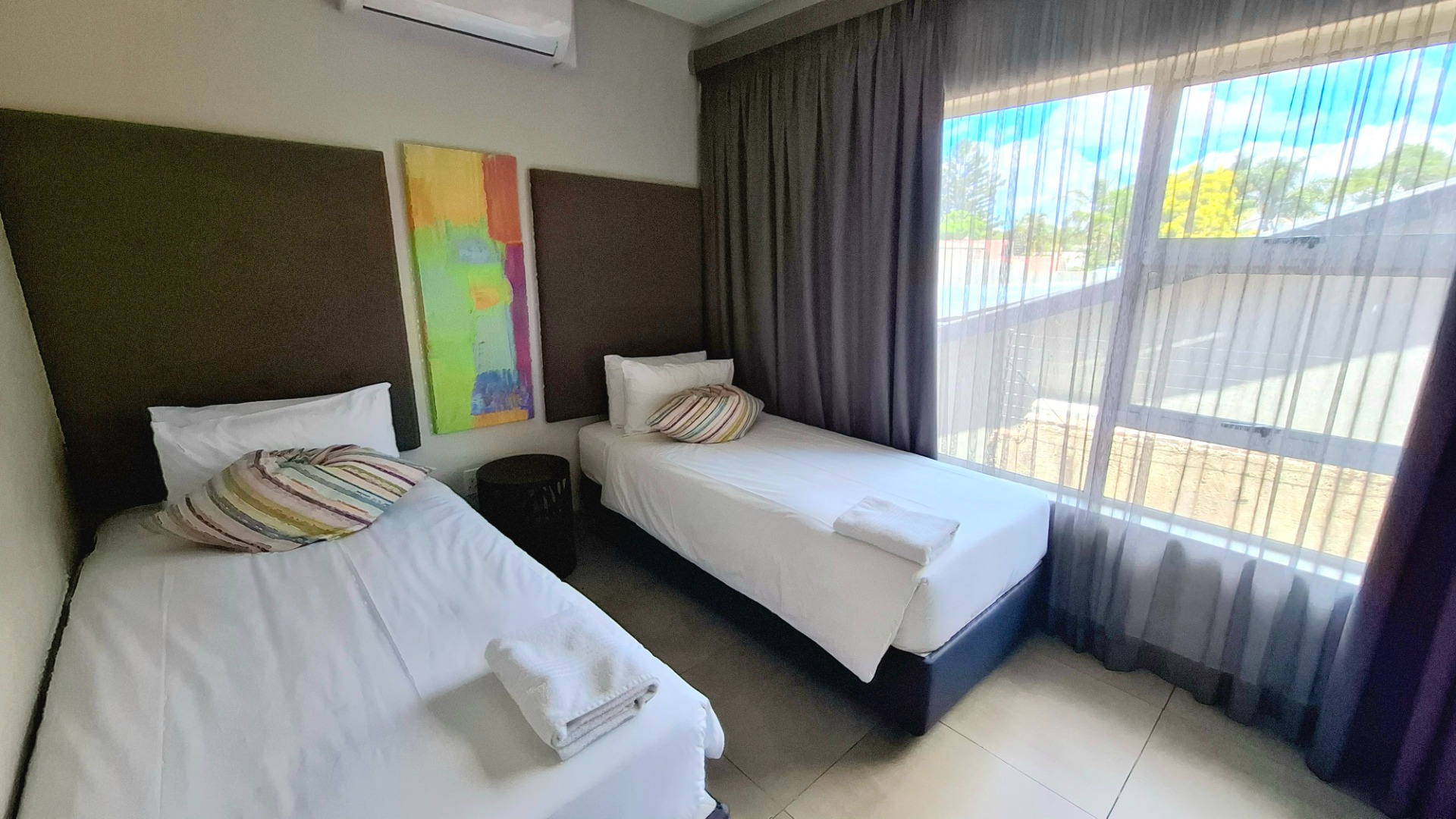 The property comprises three large bedrooms, all fitted with air conditioners for maximum comfort. There are two and a half modern bathrooms, both full bathrooms featuring showers, with the main bedroom offering a private en-suite bathroom. The bathrooms are large and finished with clean, contemporary touches.