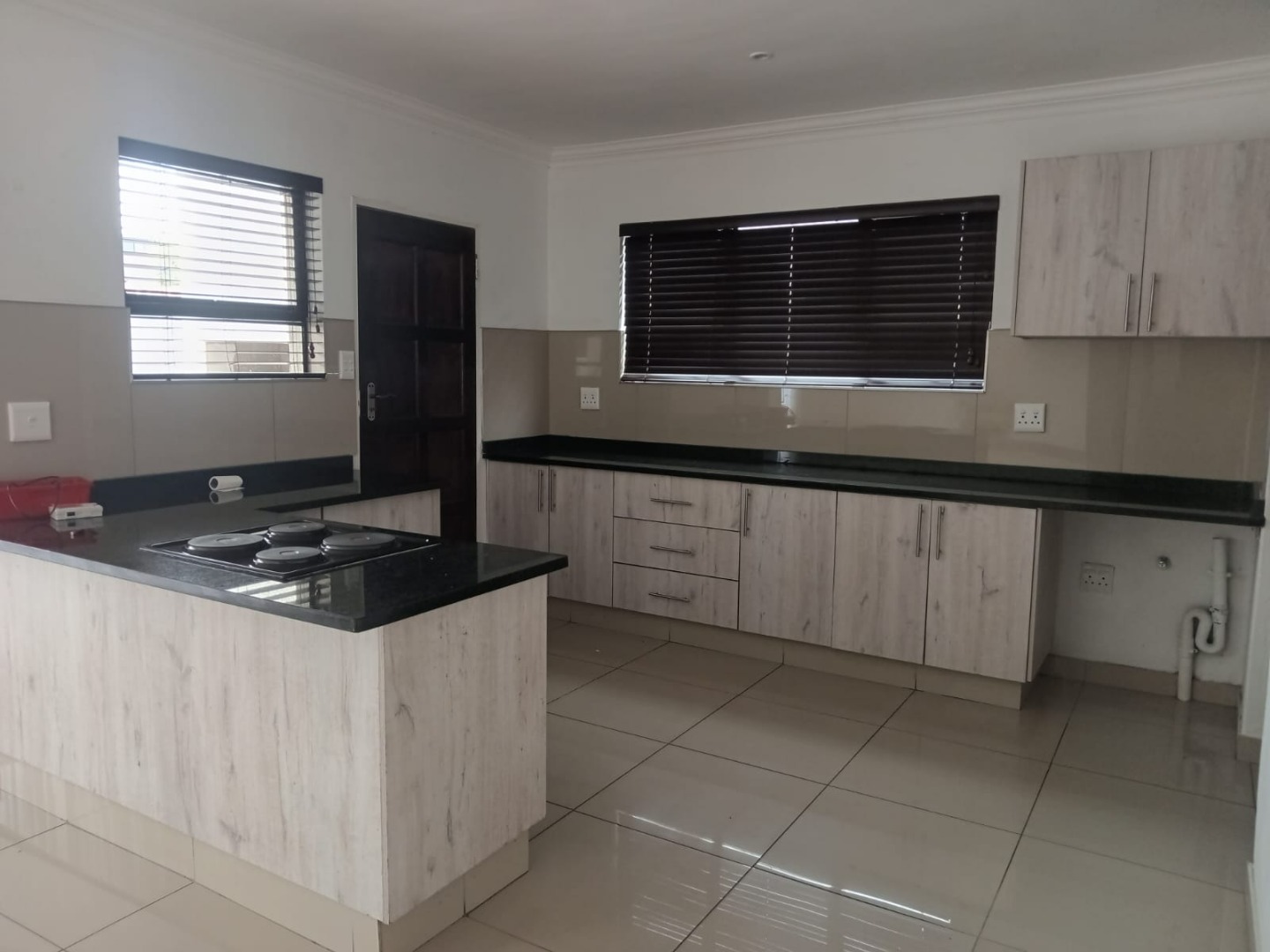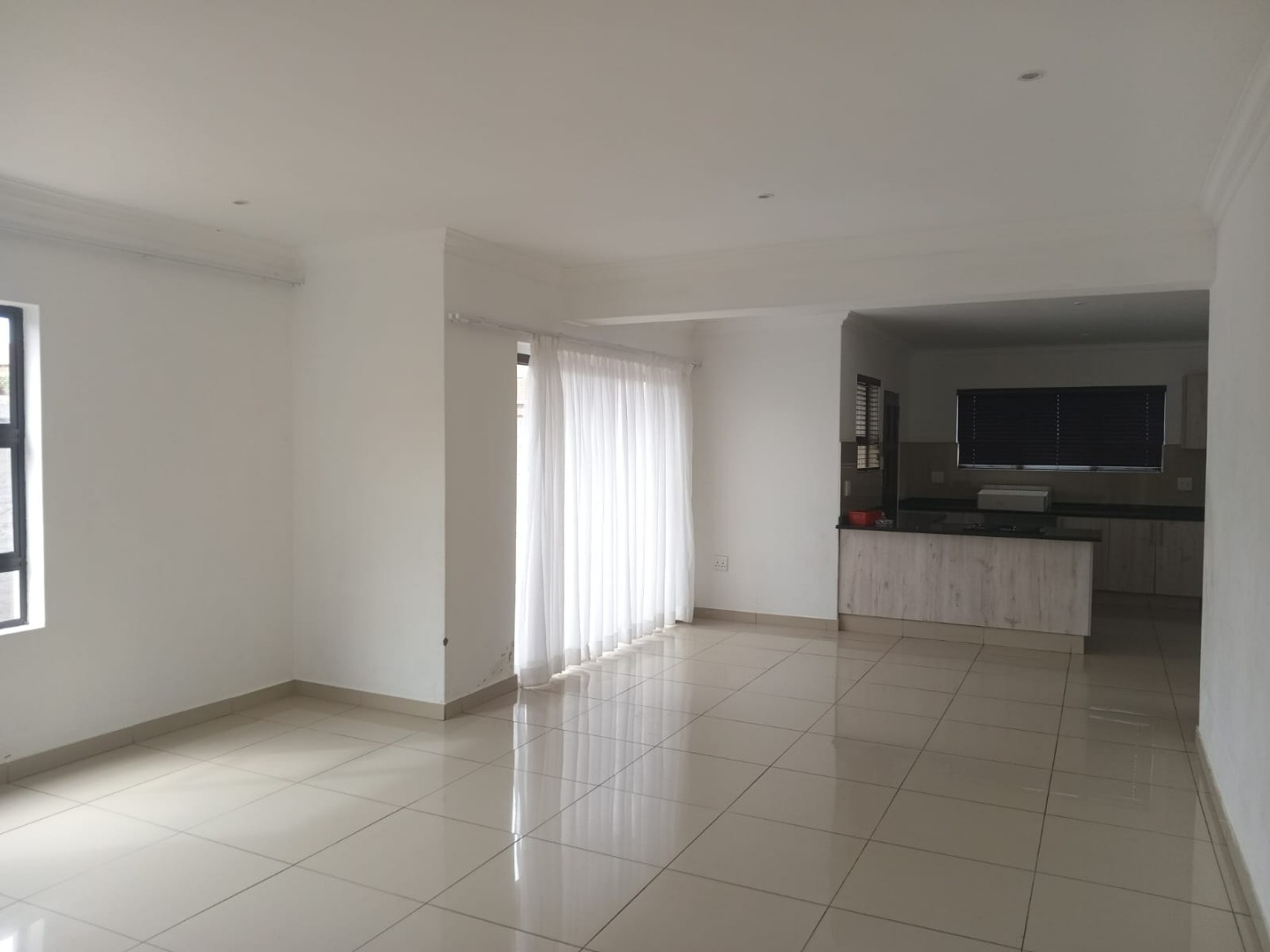 An ultra-modern open-plan kitchen with glossy finishes, quality tiling, and ample cupboard space.