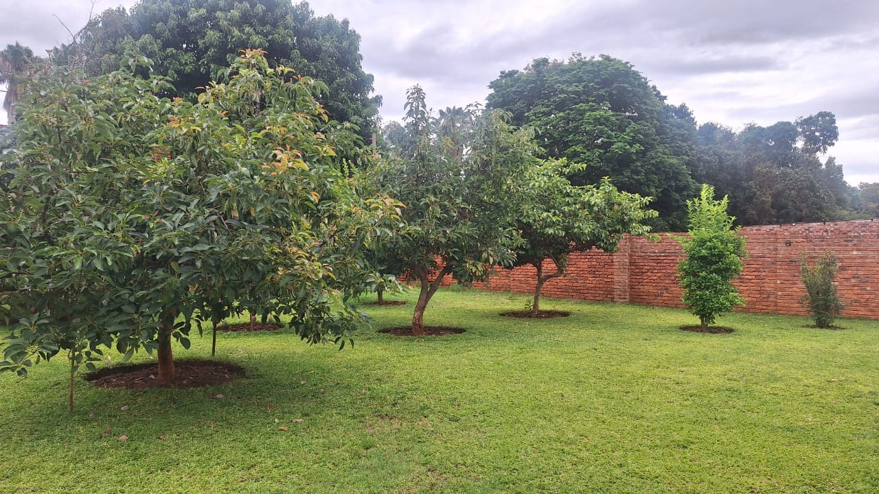 is a children’s swing. There is a well maintained garden with fruit trees in