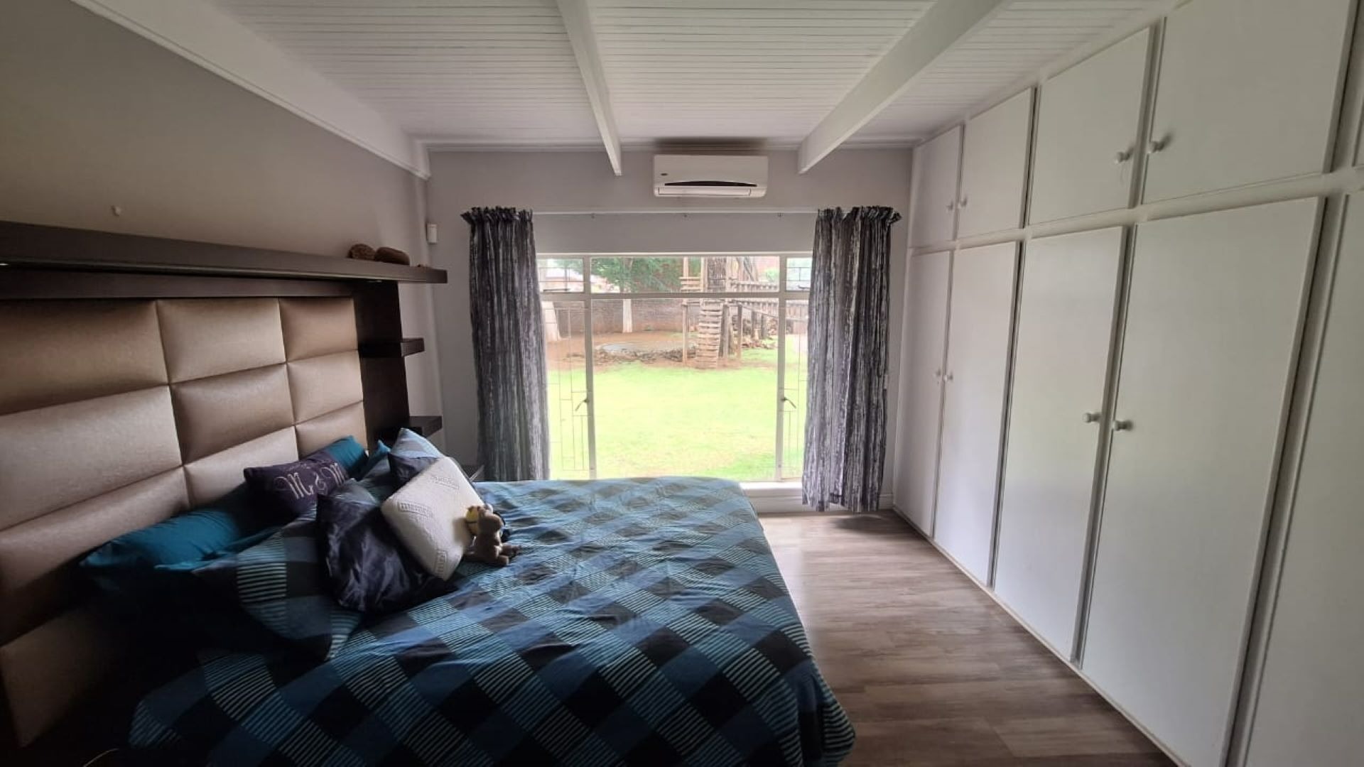 The main en-suite bedroom opens onto a closed patio, while all bedrooms feature built-in cupboards and air conditioners. Additional features include two studies, a double garage, and domestic accommodation.