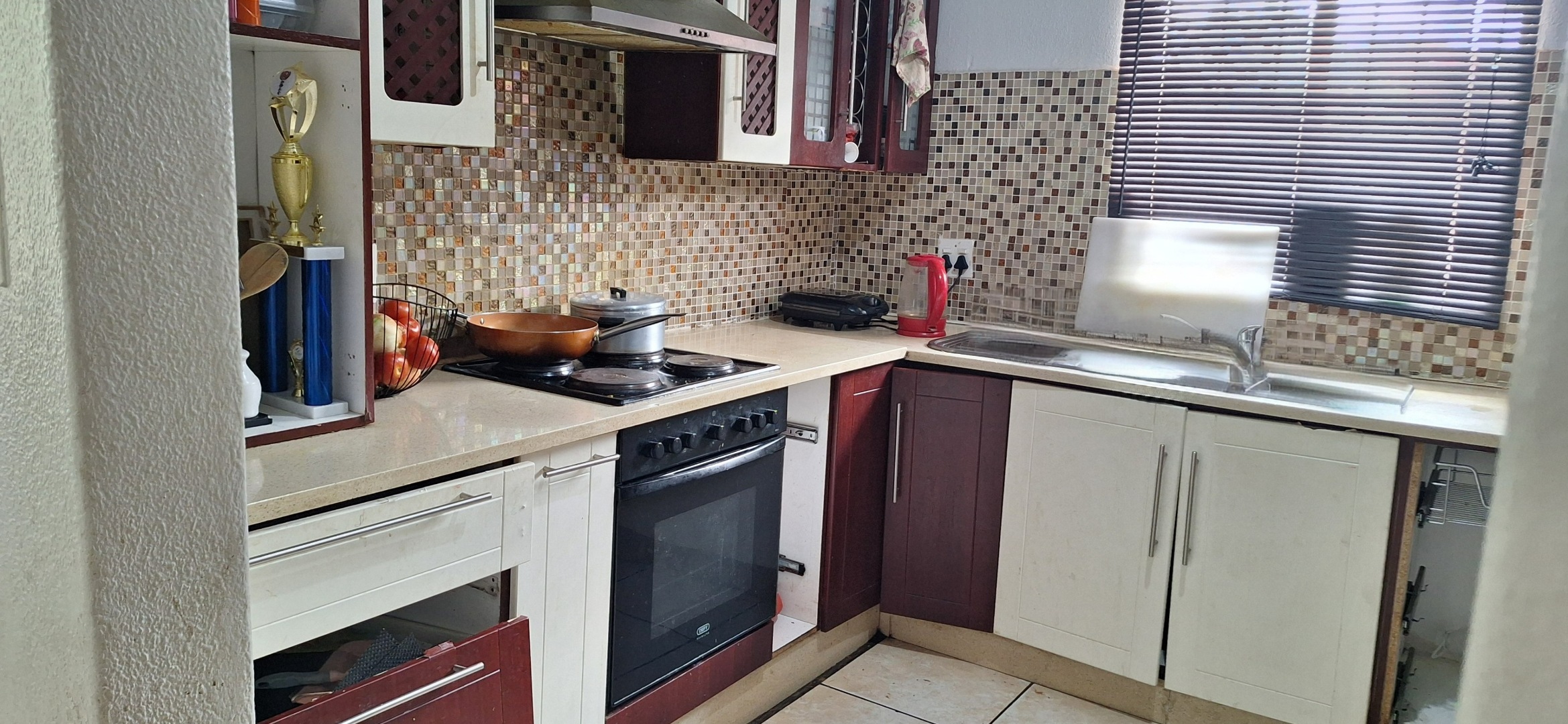Outside, the property is fully paved, providing low-maintenance surroundings and a neat appearance. A double garage and an additional carport offer secure parking for multiple vehicles. For added peace of mind, the home is fitted with strong burglar (butler) bars, ensuring safety for you and your loved ones.