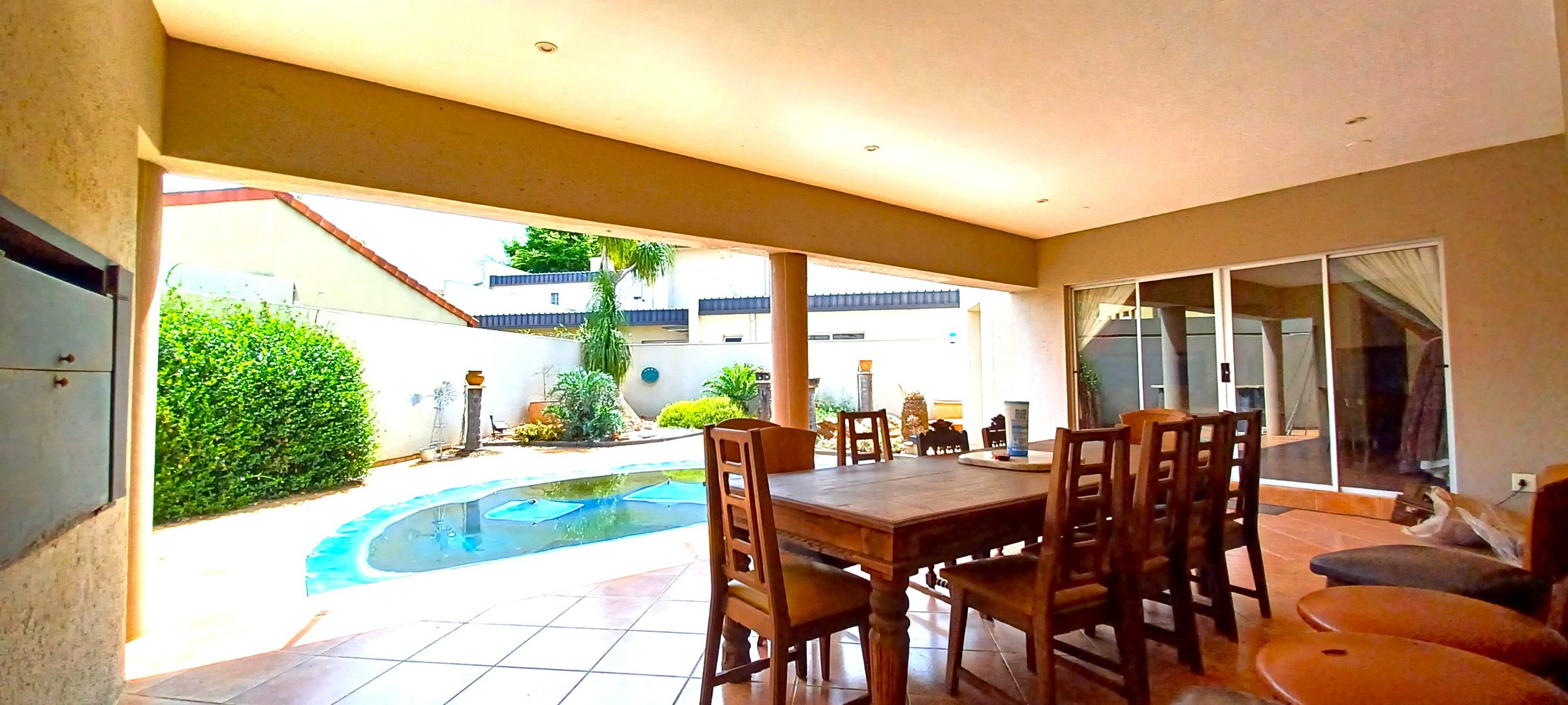 Step outside to discover a stunning garden oasis complete with a sparkling pool, a veranda with a built-in braai—perfect for entertaining guests. With additional features like a double automated garage, carport, pre-paid electricity, and municipal water, this home offers ultimate convenience and peace of mind.