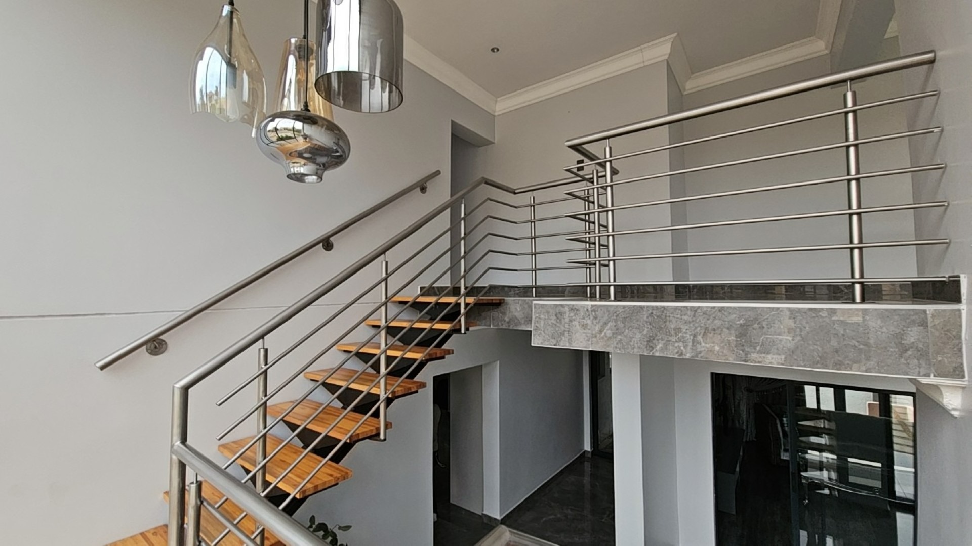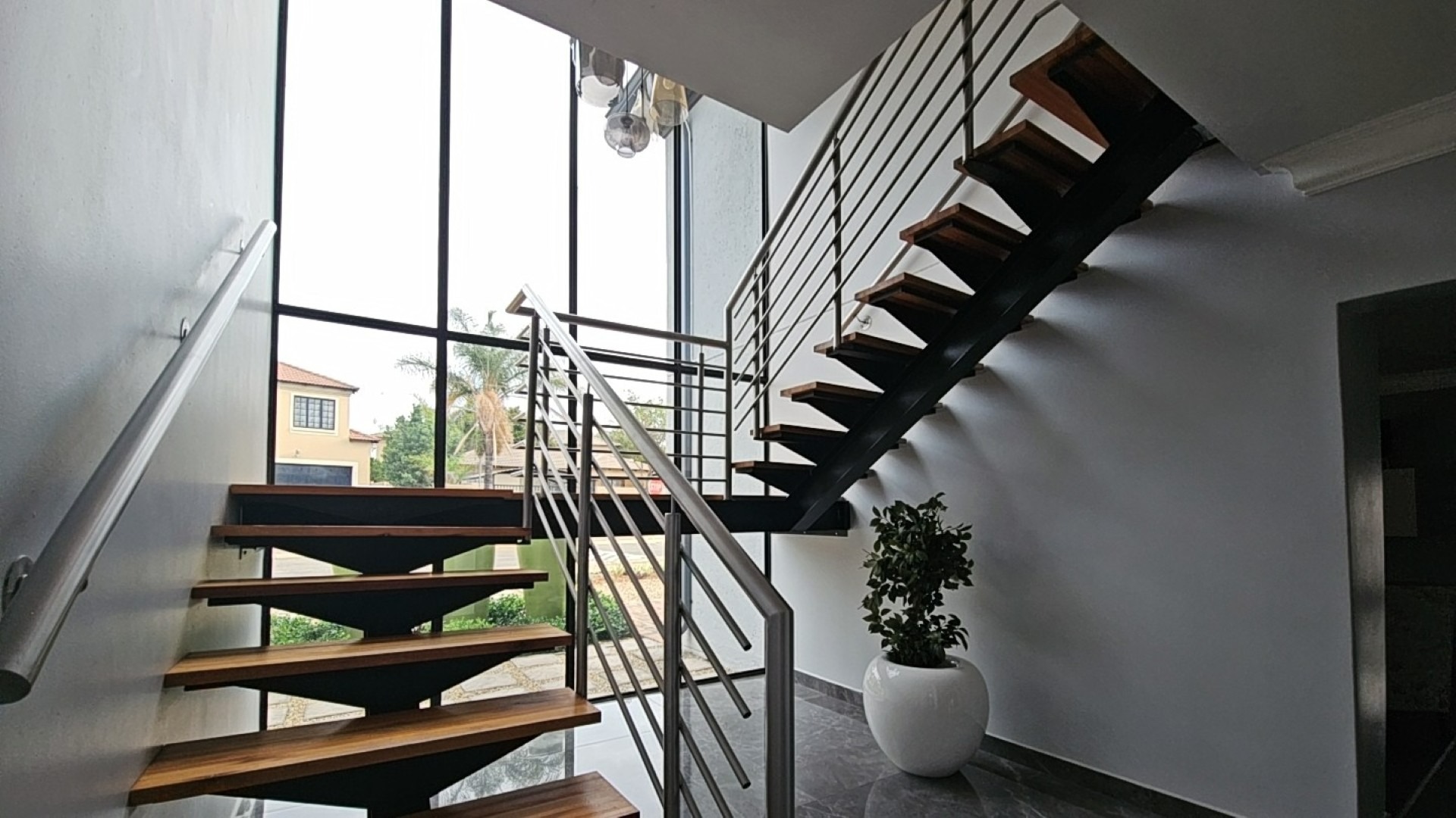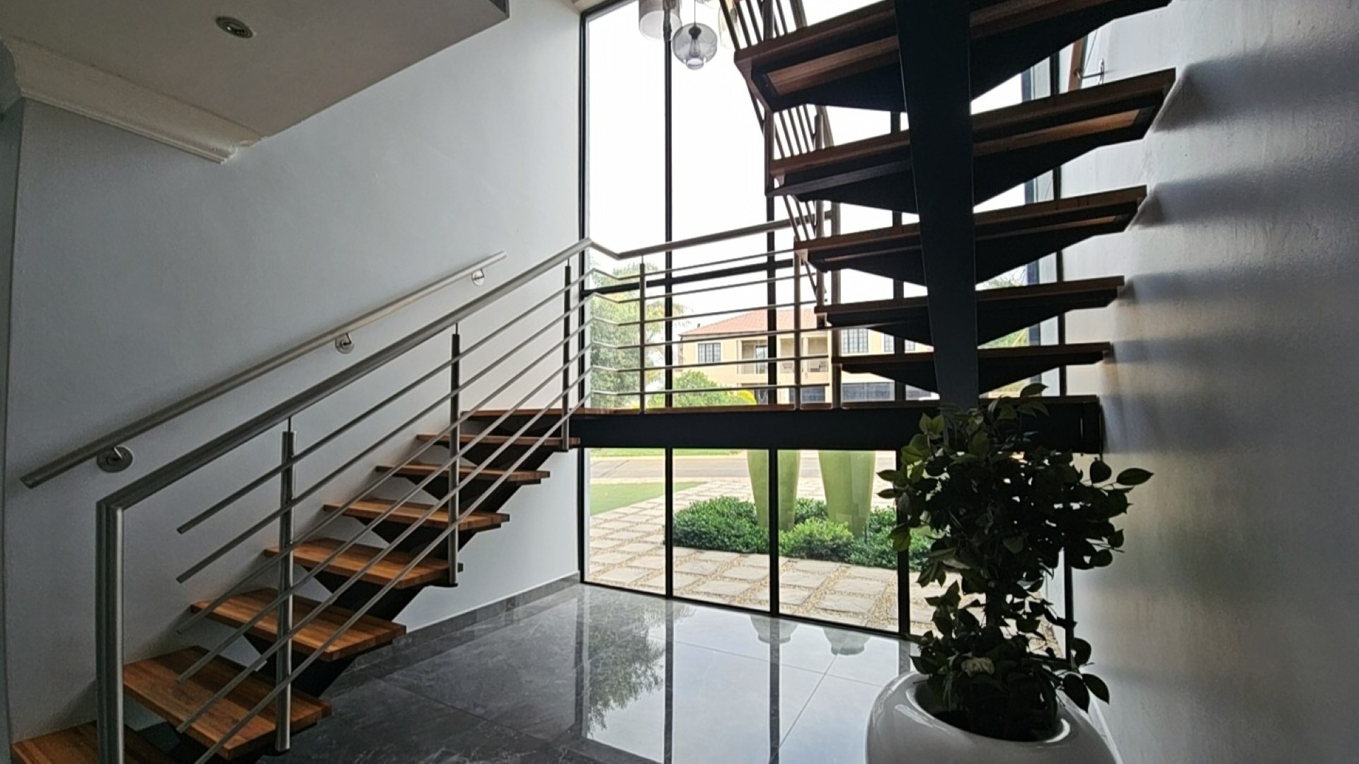 spaces and elegant design. To the left, a staircase leads to the upper floor,