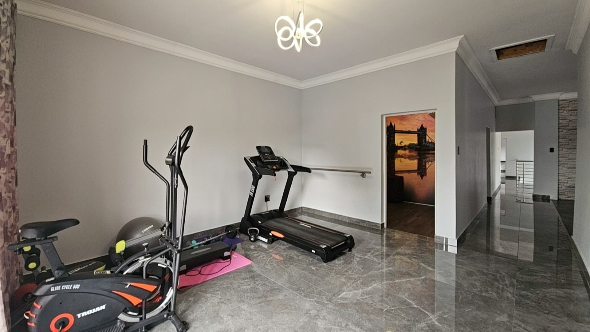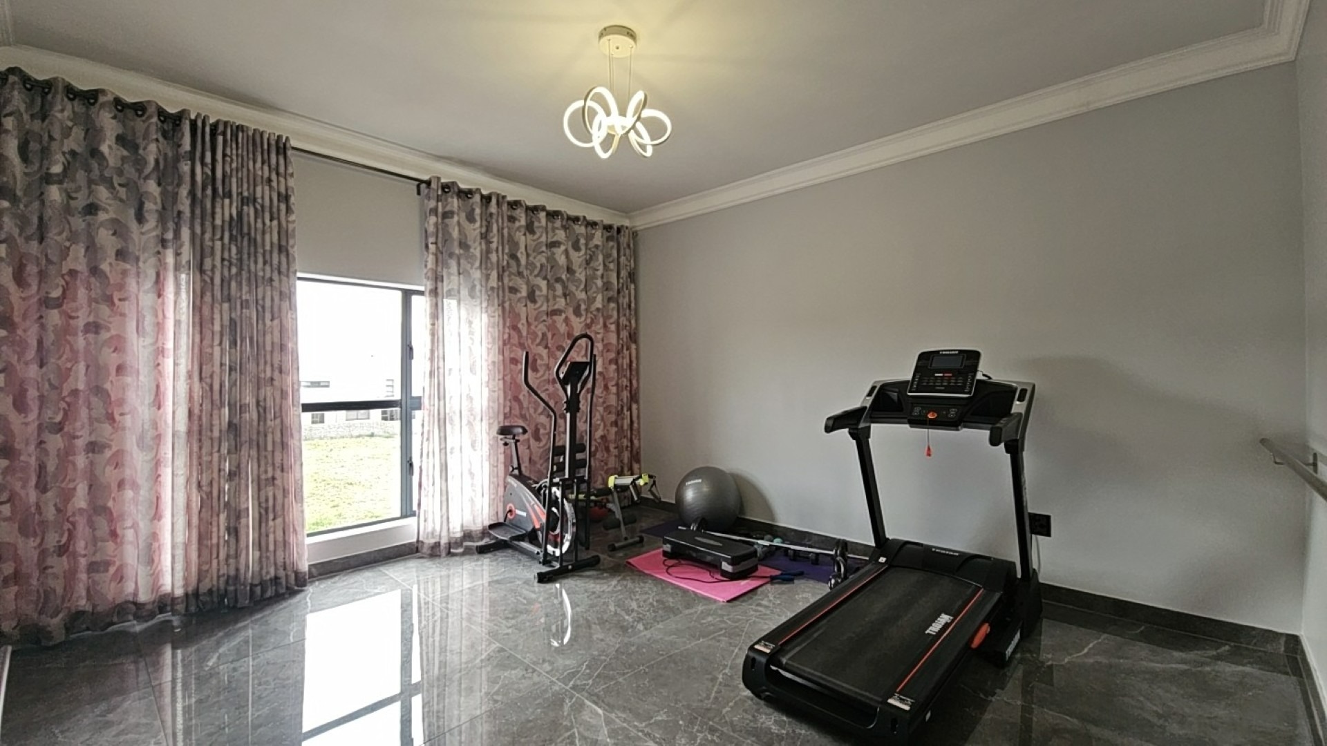 a passage that connects the gym area and storeroom. Three additional bedrooms