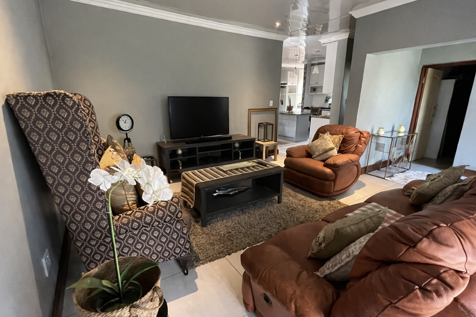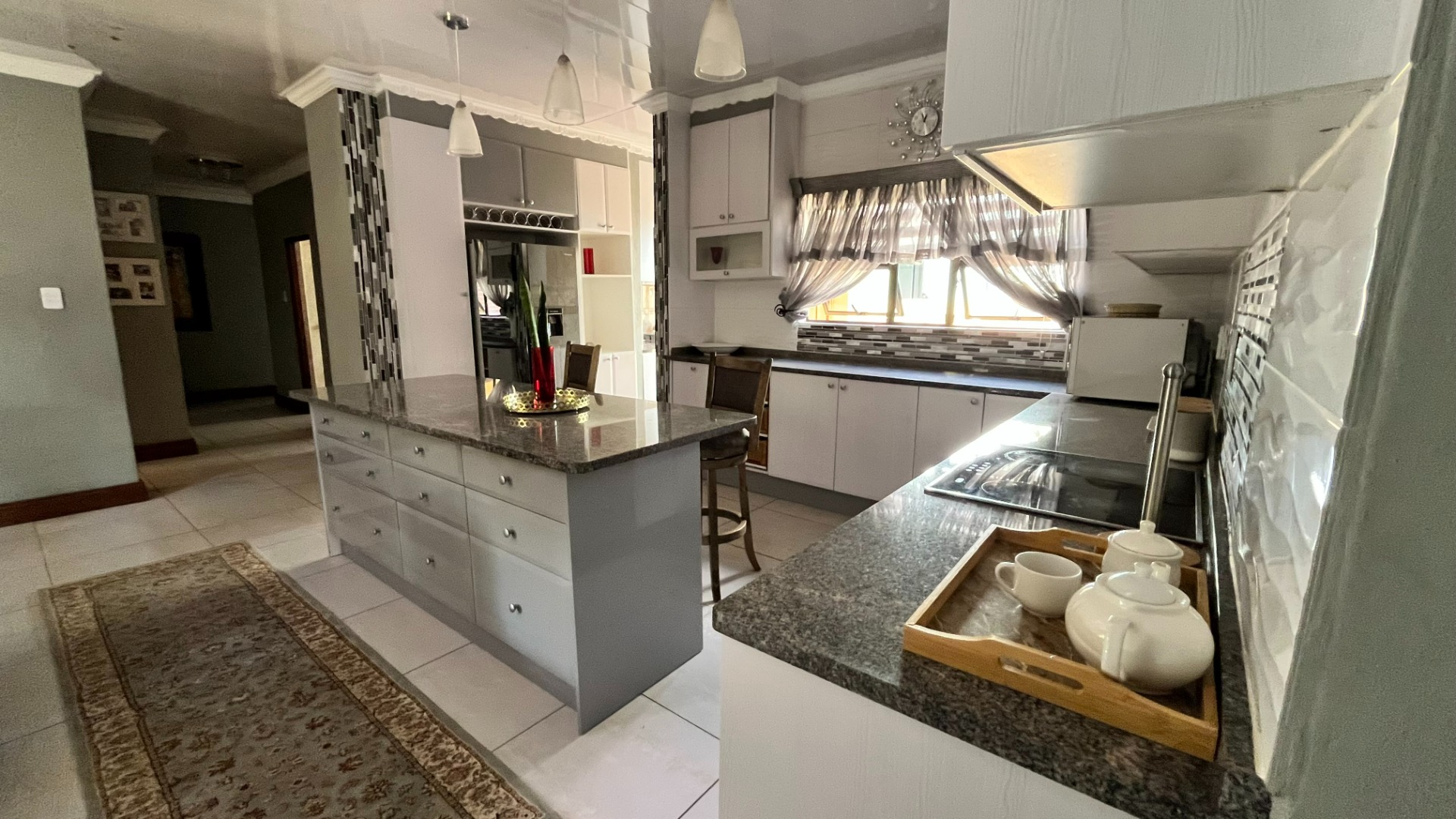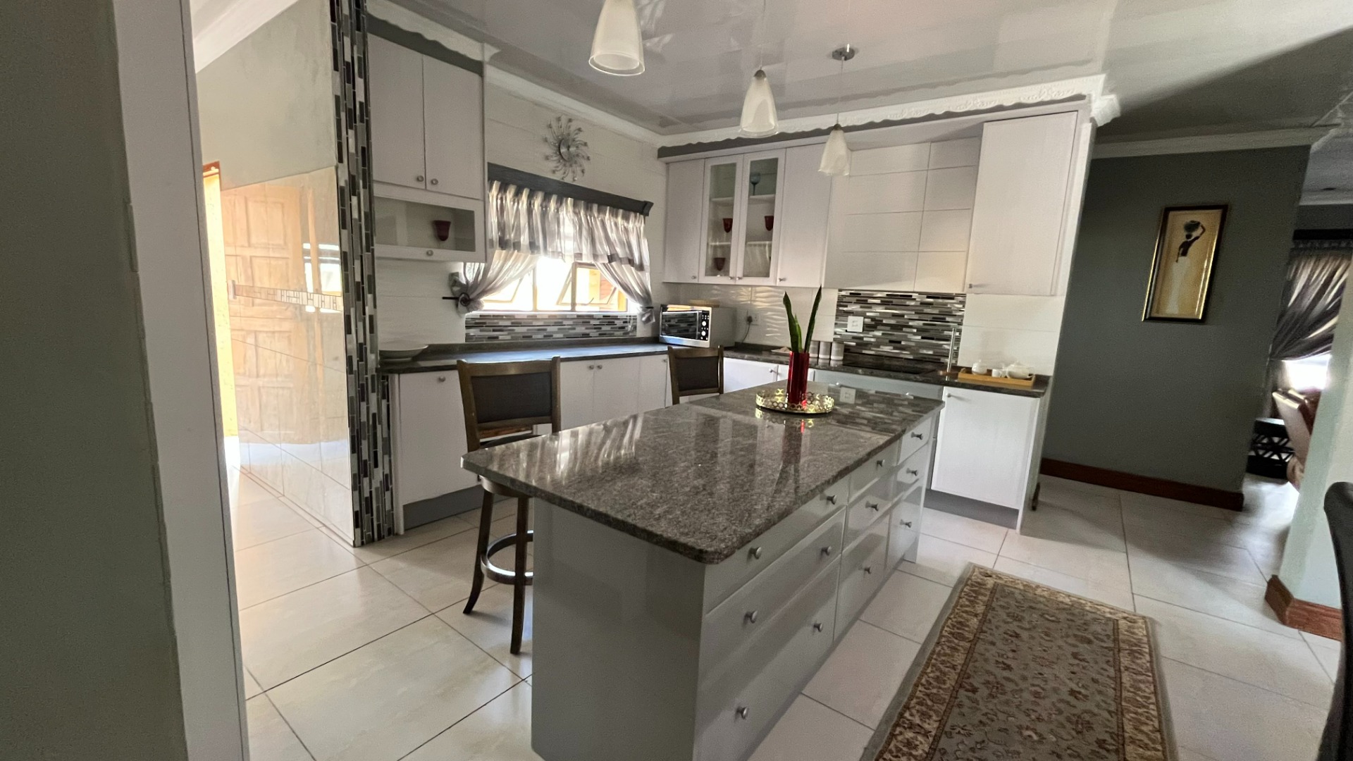 The home features a spacious open-plan layout, seamlessly connecting the kitchen, lounge, and dining area to create a warm and inviting atmosphere. The kitchen is both stylish and functional, complemented by a separate scullery that adds convenience and keeps the living space clutter-free.