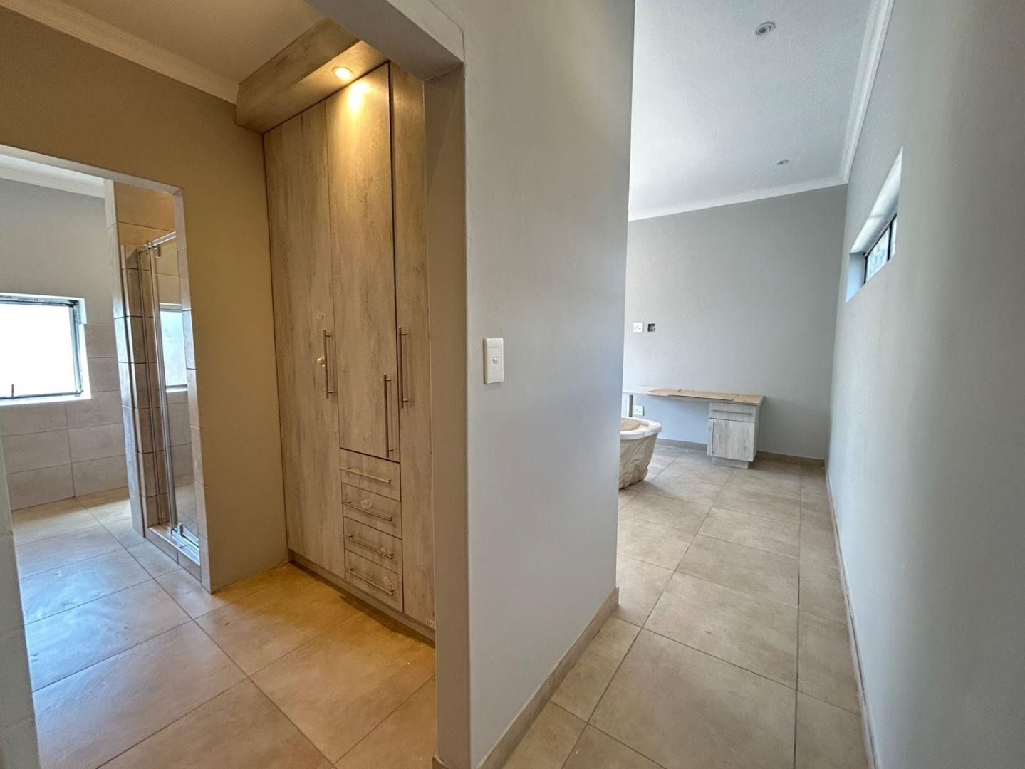 Bedroom 1 Tiled Floors, Built-in Cupboards, King Bed, En-Suite Bathroom, Dressing Area