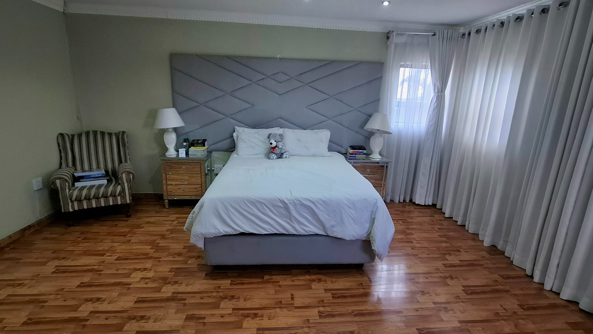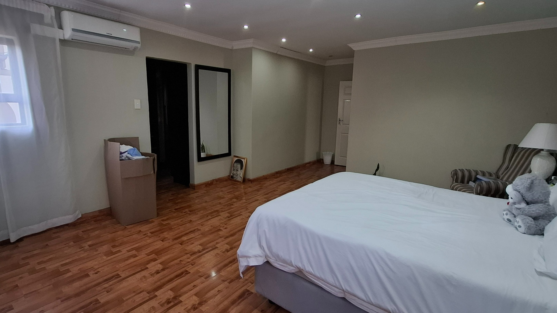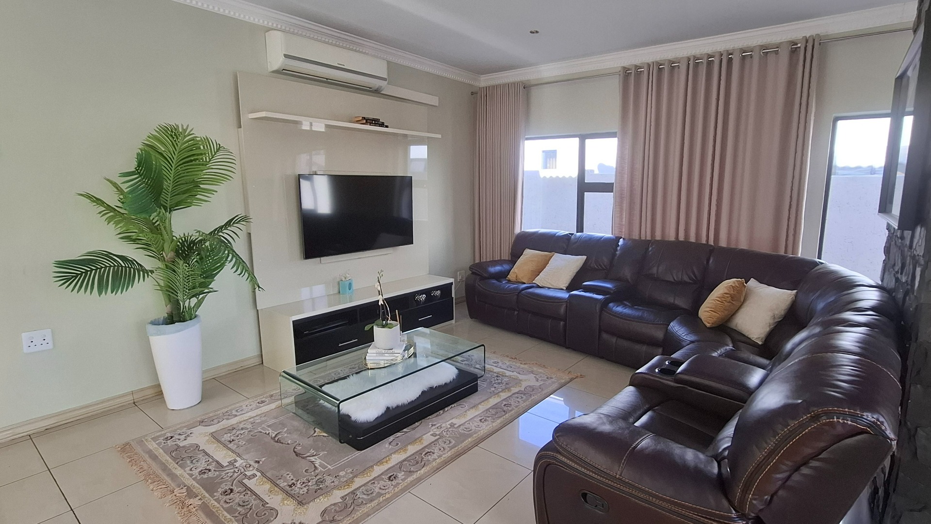 Each of the five generously proportioned bedrooms includes ample built-in cupboard space, while three of the 4.5 bathrooms are en-suite, offering privacy and comfort for every family member. A cozy upstairs pyjama lounge provides a quiet retreat, and air-conditioning throughout ensures year-round comfort.