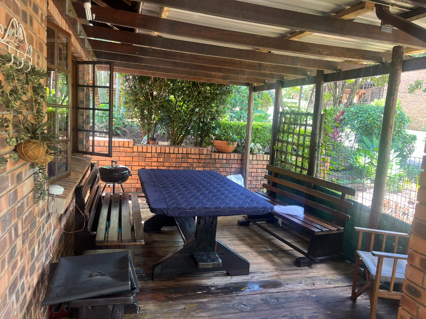 Covered patio to relax under with a wooden deck to take in the stunning views of the well-maintained garden.