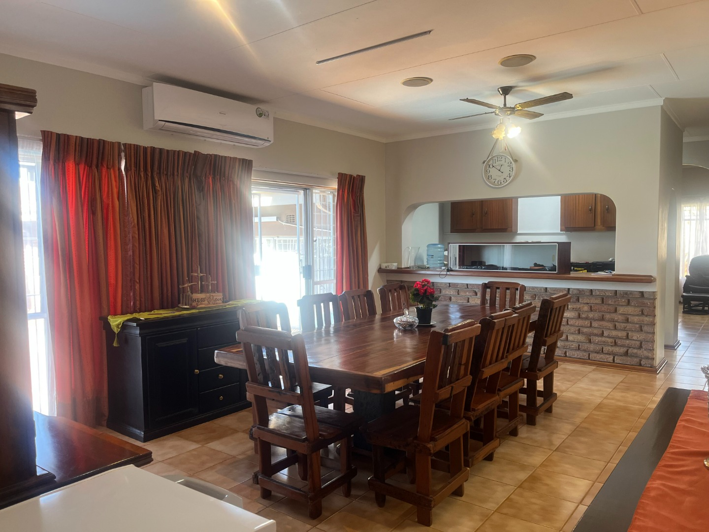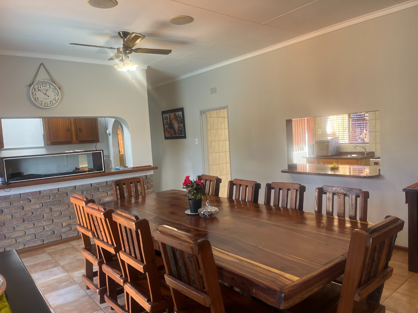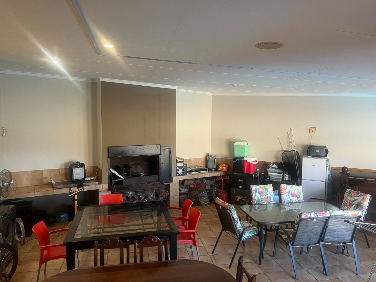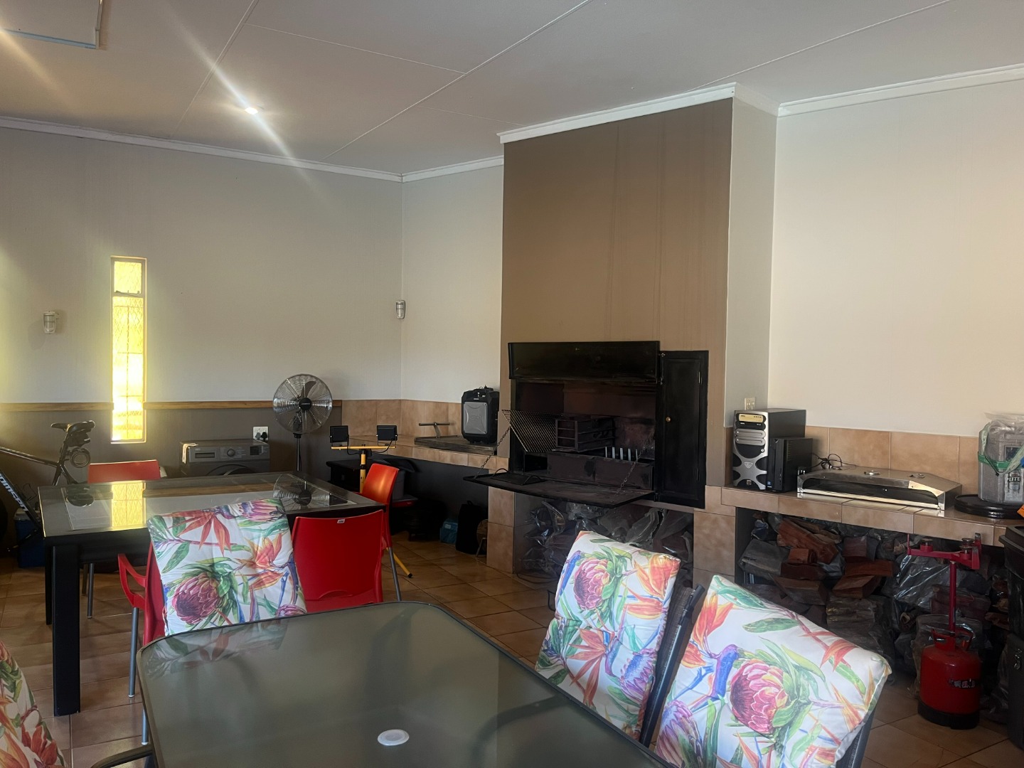 Lovely, large entertaining area with a built-in braai and roll up blinds which connects to the house via sliding doors.