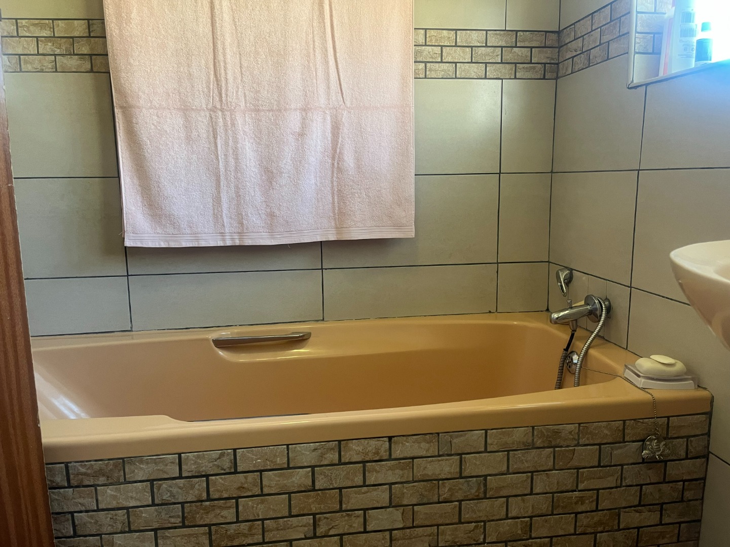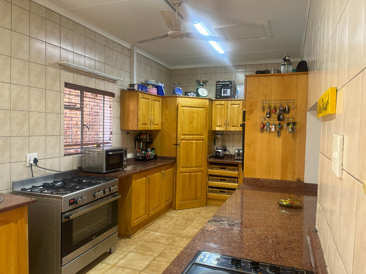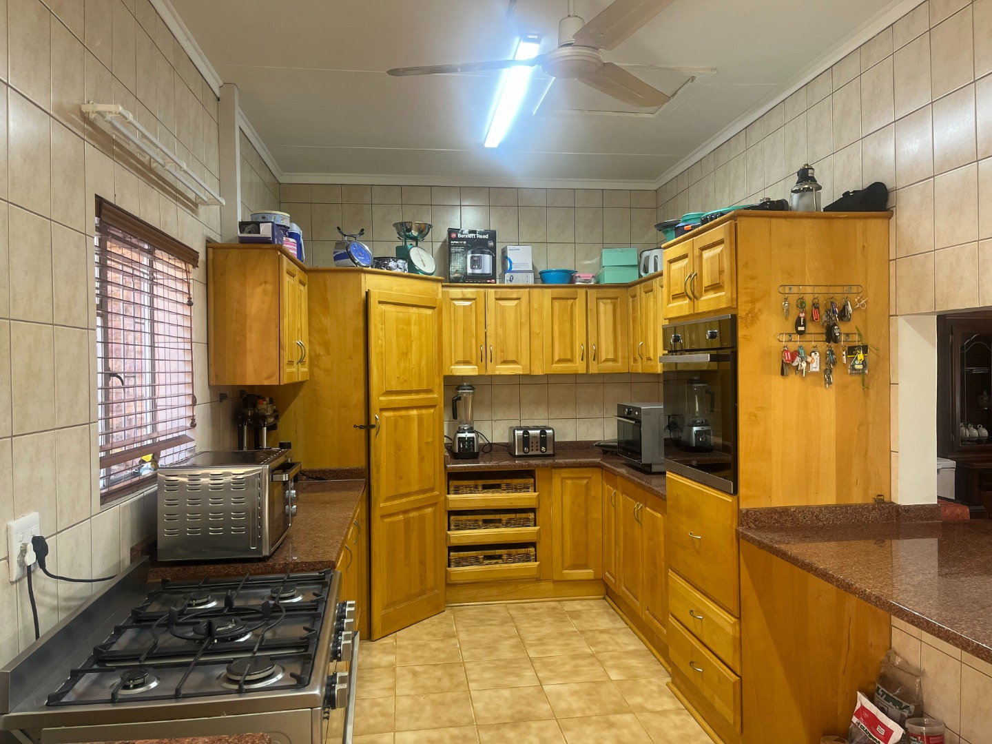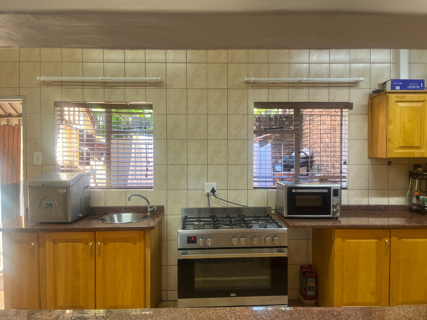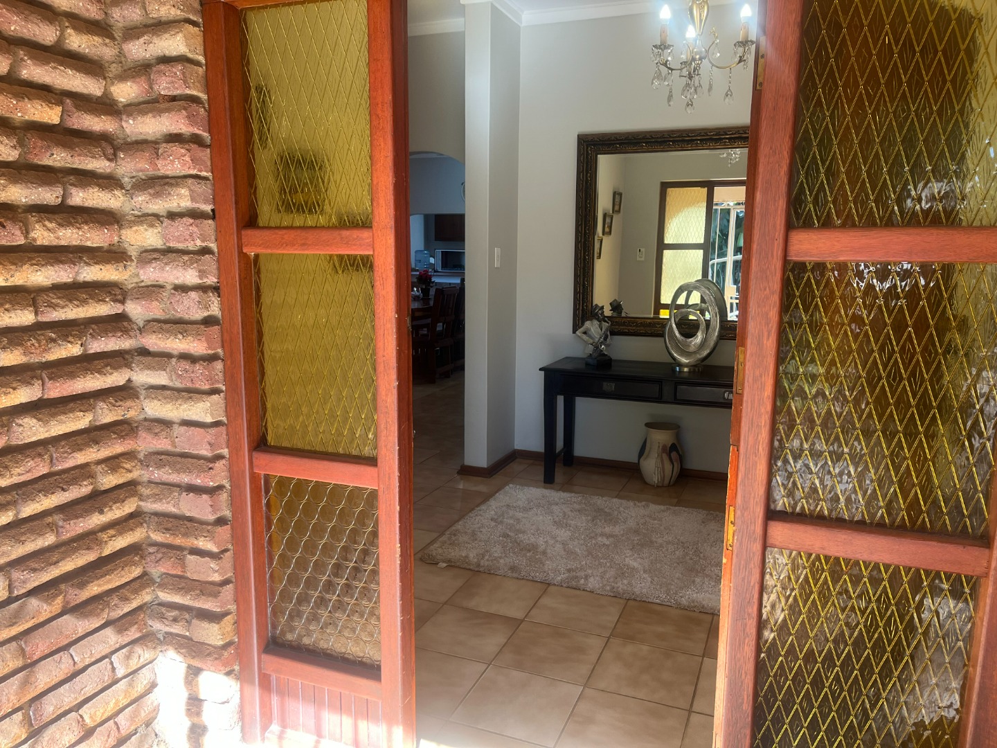 Lovely, large entertaining area with a built-in braai and roll up blinds which connects to the house via sliding doors.