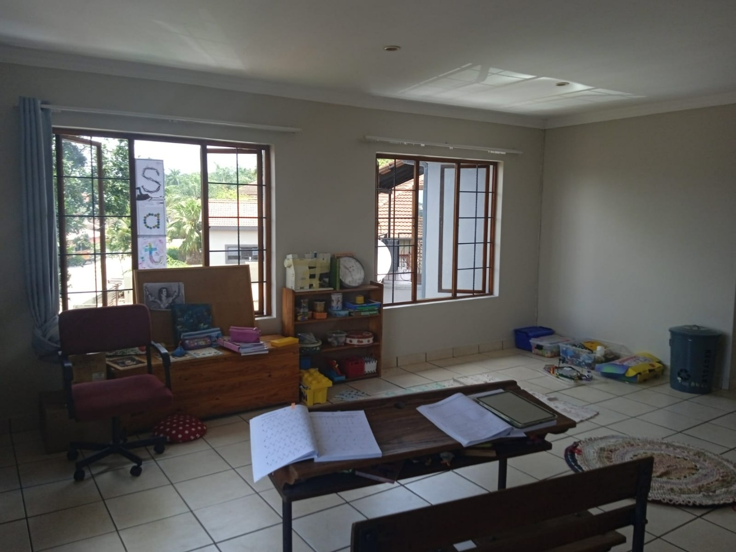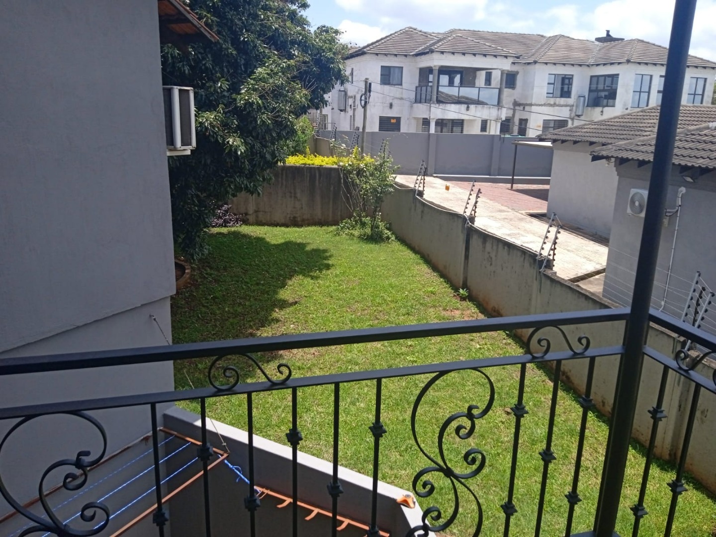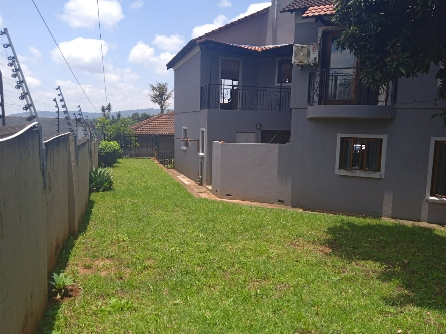 Upstairs, the home offers four generously sized bedrooms, all fitted with built-in cupboards and air conditioning for year-round comfort. The main bedroom includes a modern en-suite bathroom and opens onto a private balcony. The remaining bedrooms are serviced by a full family bathroom.