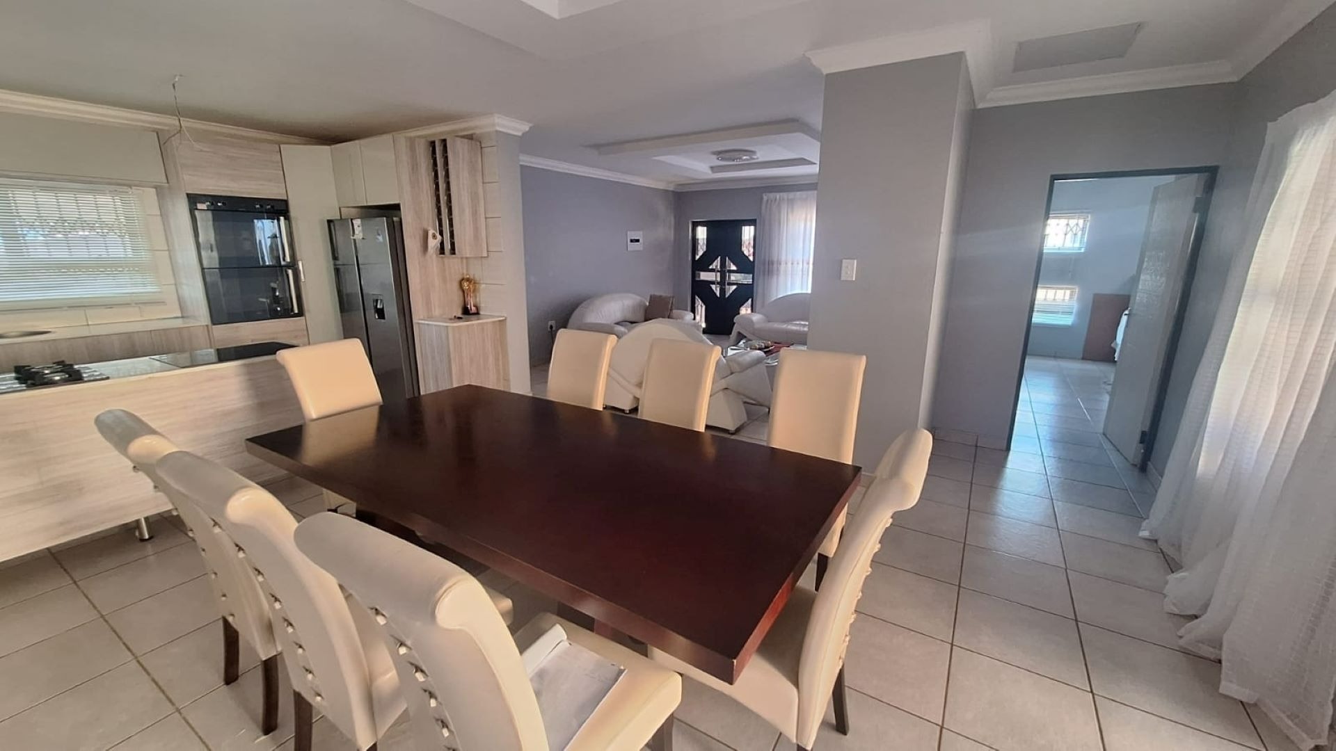 The open-plan kitchen is fitted with built-in cupboards, a center island flowing seamlessly into the dining area. The dining room is spacious and tiled, while the family/TV room features tiled flooring, curtain rails, a ceiling fan, and access to the outdoor area.