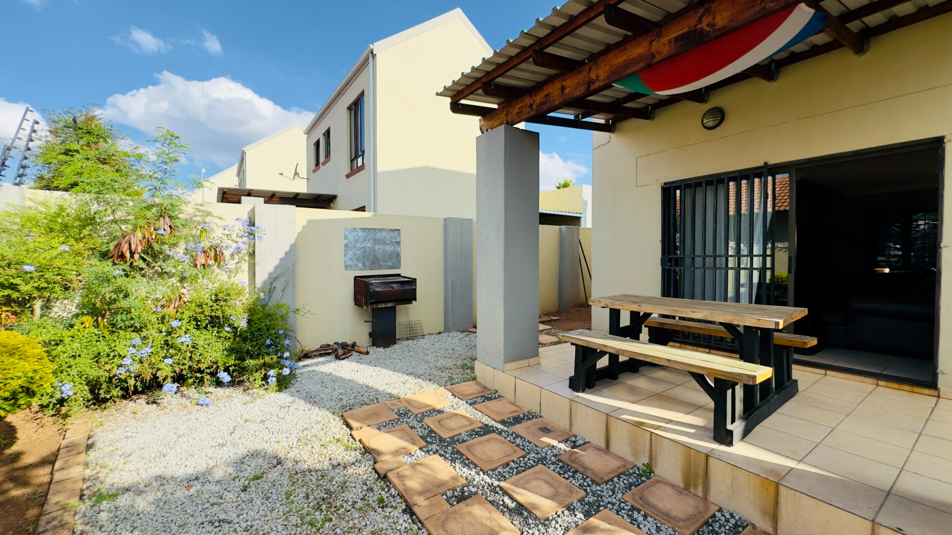 Outside, you’ll find a stunning, low-maintenance garden paired with a private terrace—perfect for entertaining, featuring a built-in braai for relaxed outdoor living.
