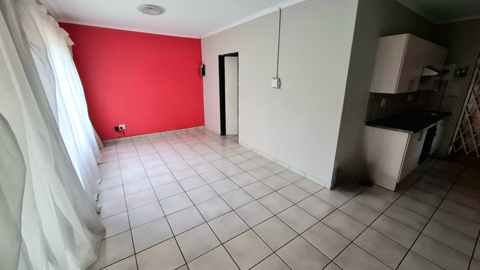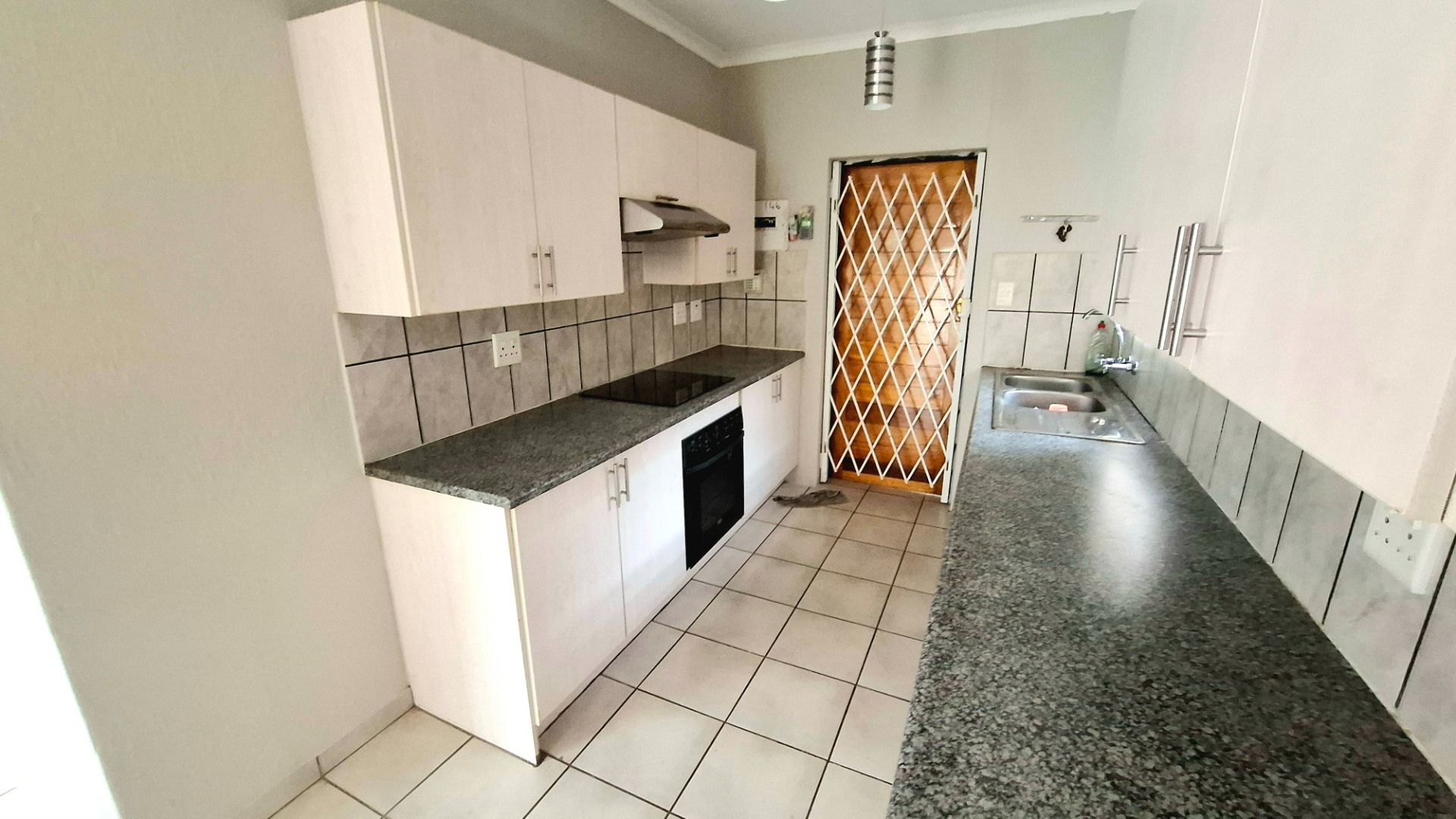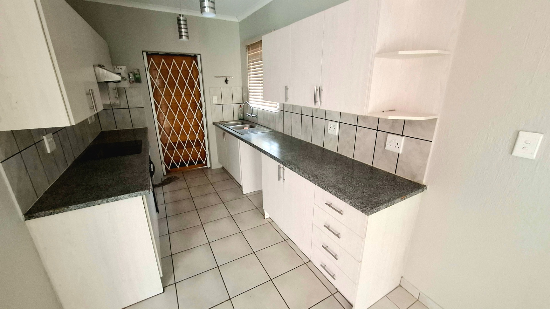 Accessed through a sliding door from the patio, the home opens into a generous open-plan living space that seamlessly combines the lounge, dining area, and kitchen. The kitchen is well-equipped with a four-plate electric stove, double sink, and includes direct access to the backyard for added convenience.