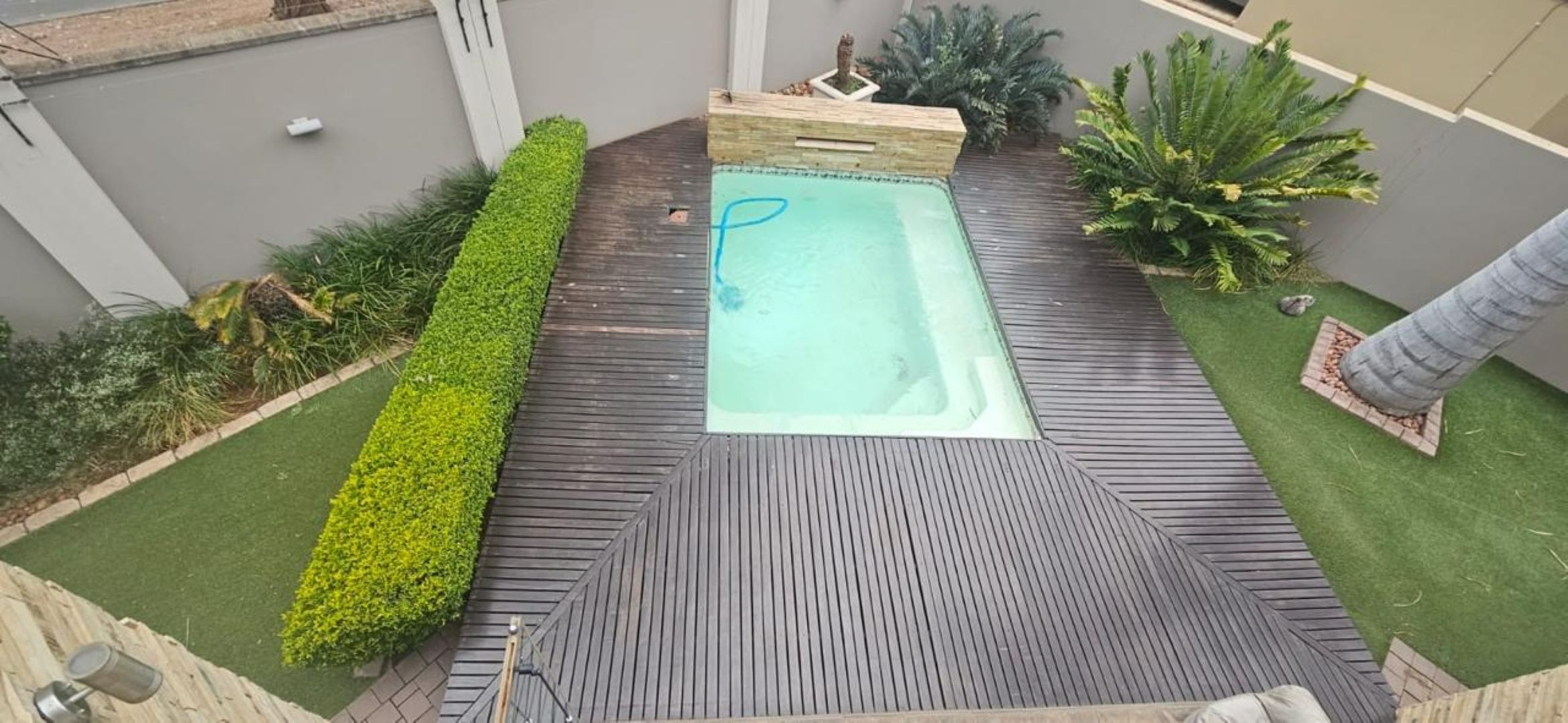 • Landscaped Garden – Neatly designed with palm trees and cycads, complemented by a pool, wooden deck, and low-maintenance artificial lawn.