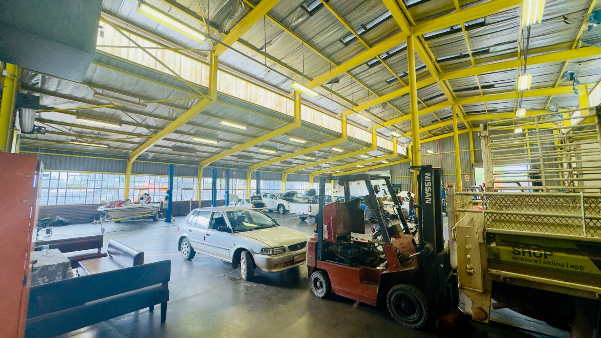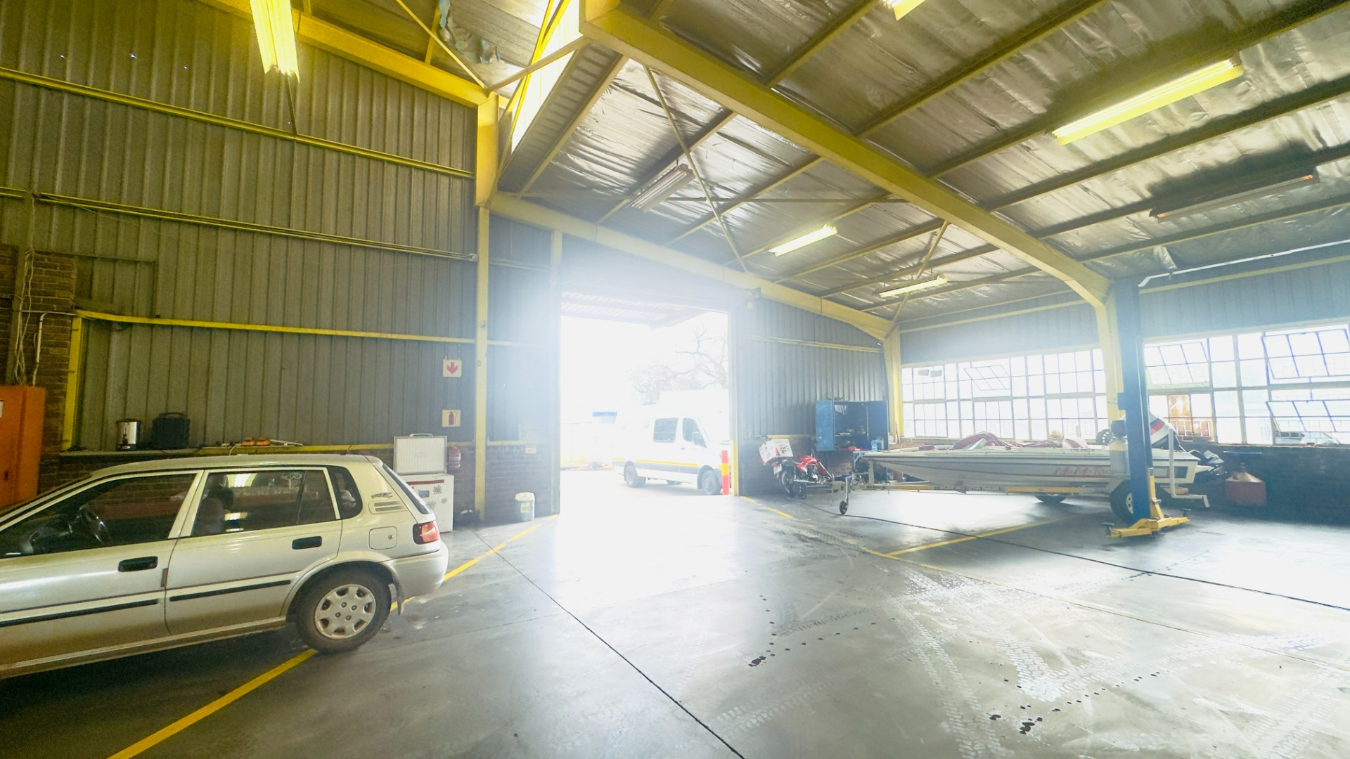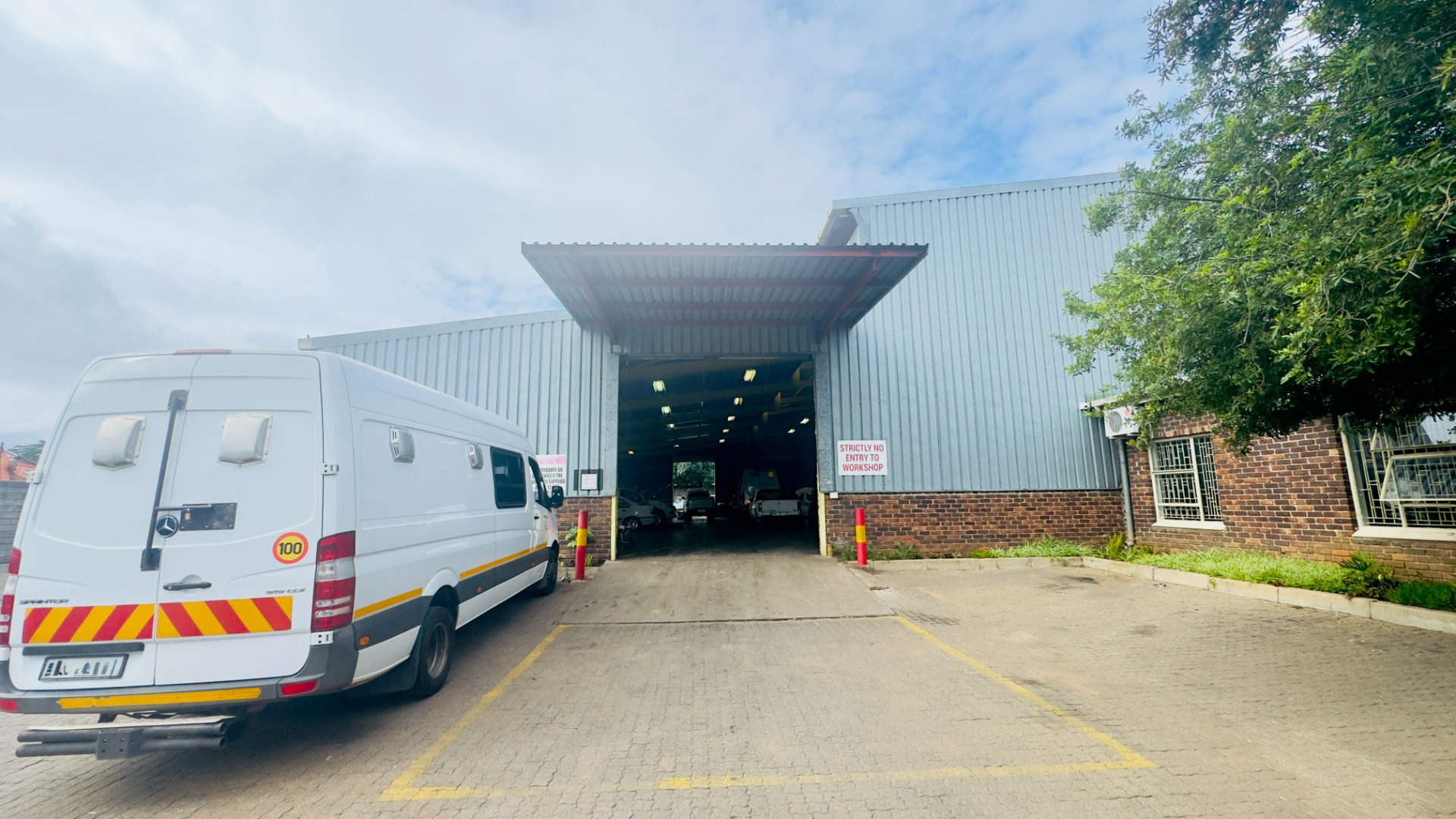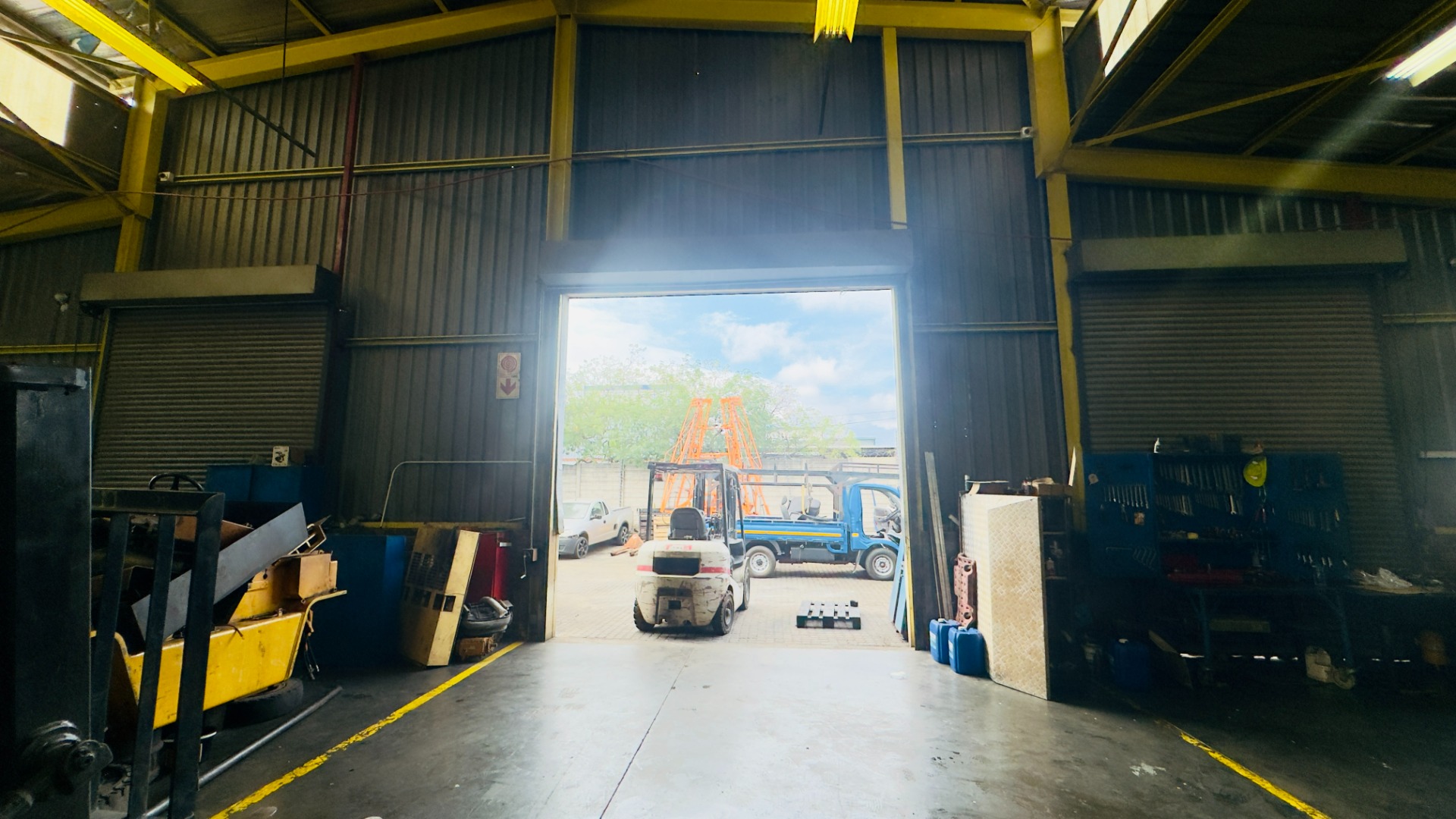The workshop features an impressive ±8-metre internal height clearance, providing ample space for heavy-duty operations, servicing, and vertical storage. Access is facilitated via three large roller shutter doors (±5m height clearance), allowing for seamless movement of trucks, interlinks, and large equipment.