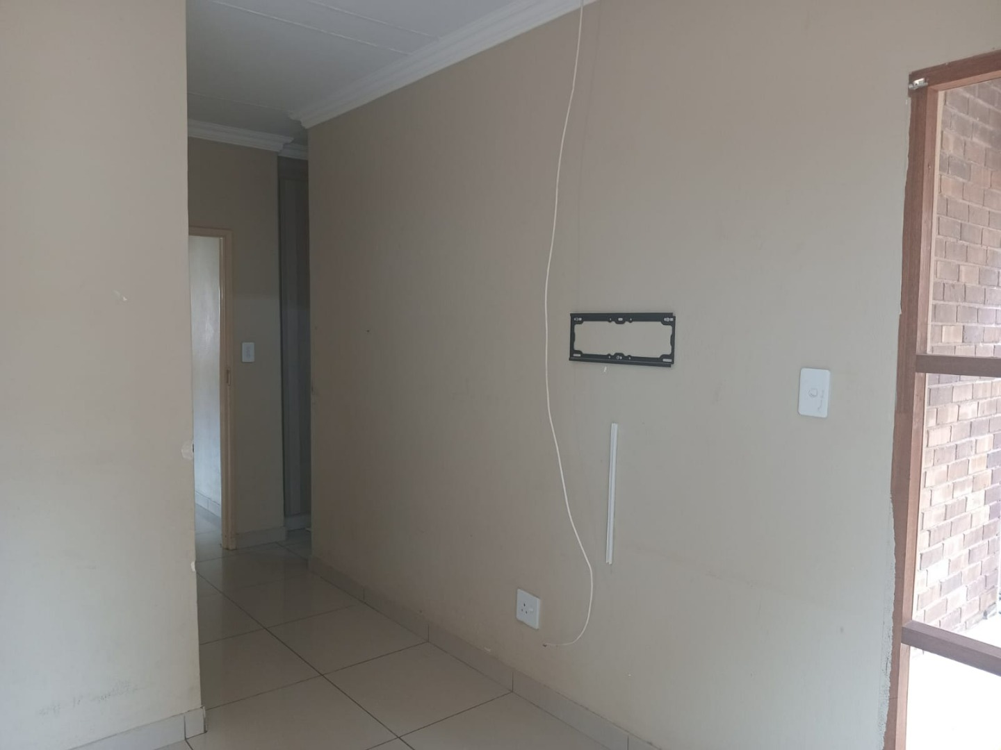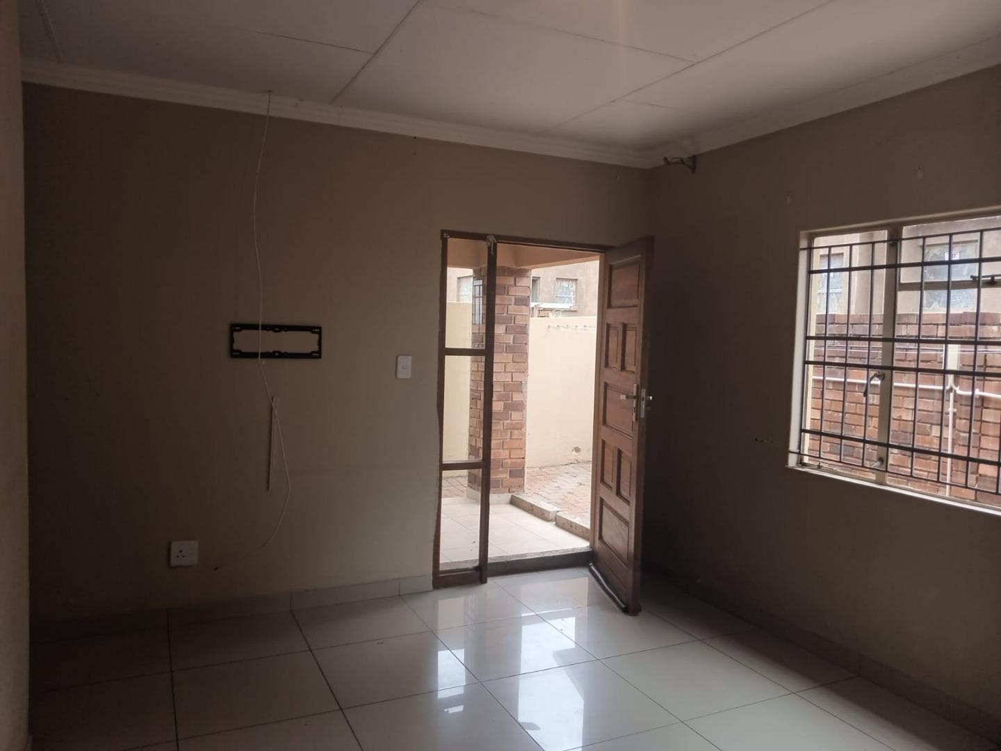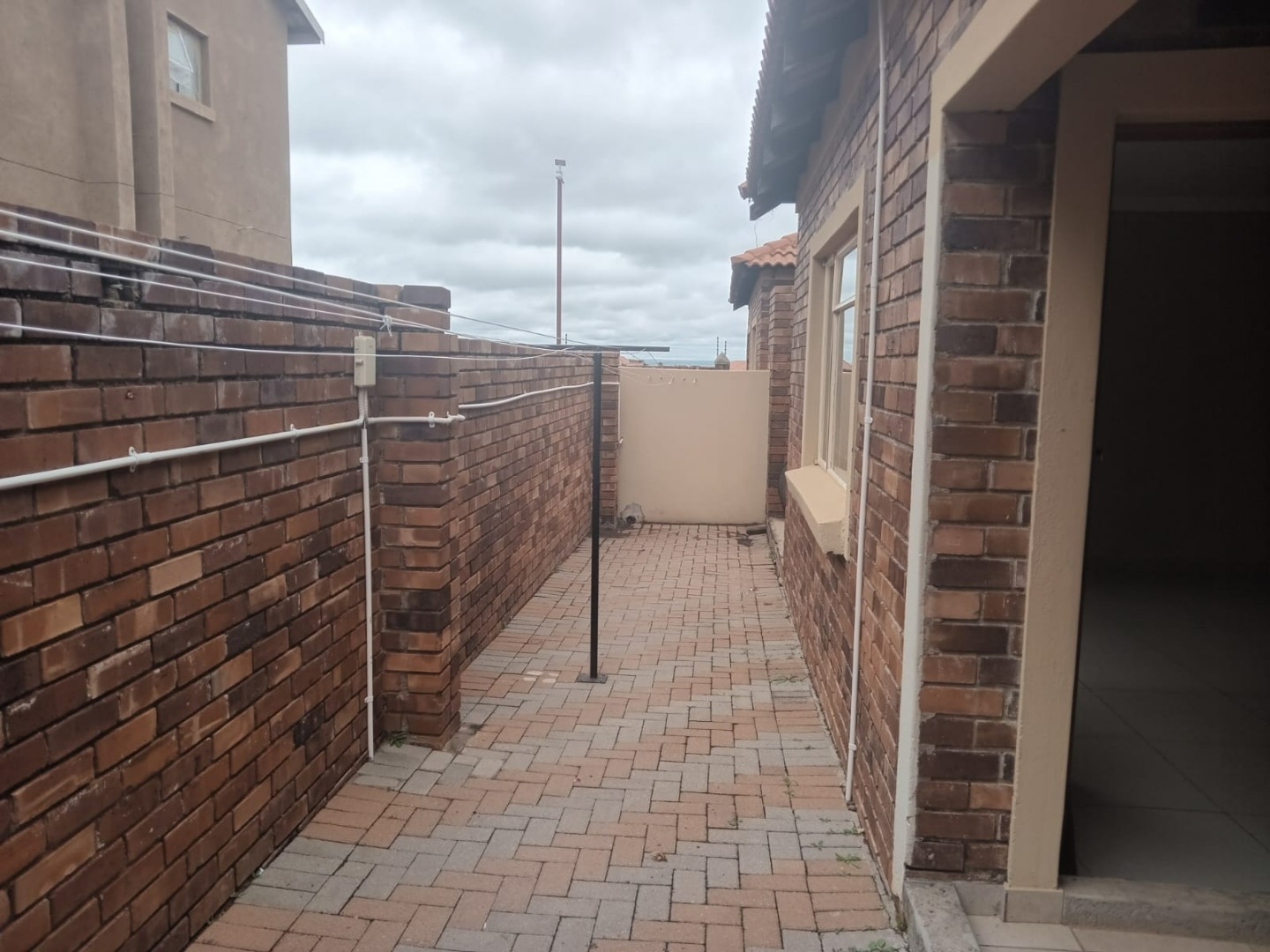 The property further boasts a spacious lounge that leads out to a private veranda, creating a perfect space for relaxation or entertaining. A single garage is included, and the estate offers electric fencing and security for added peace of mind. Electricity and water are prepaid.